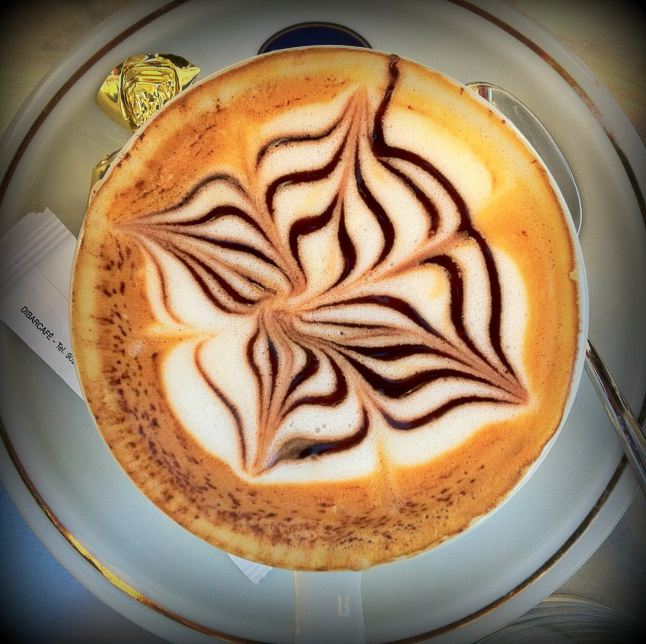 Een kunstig aangebracht patroon een in overheerlijke kop cappuccino in Barcelona