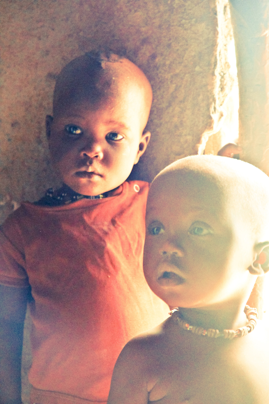 Children in their cool hut with the warm sun shining through the door opening.