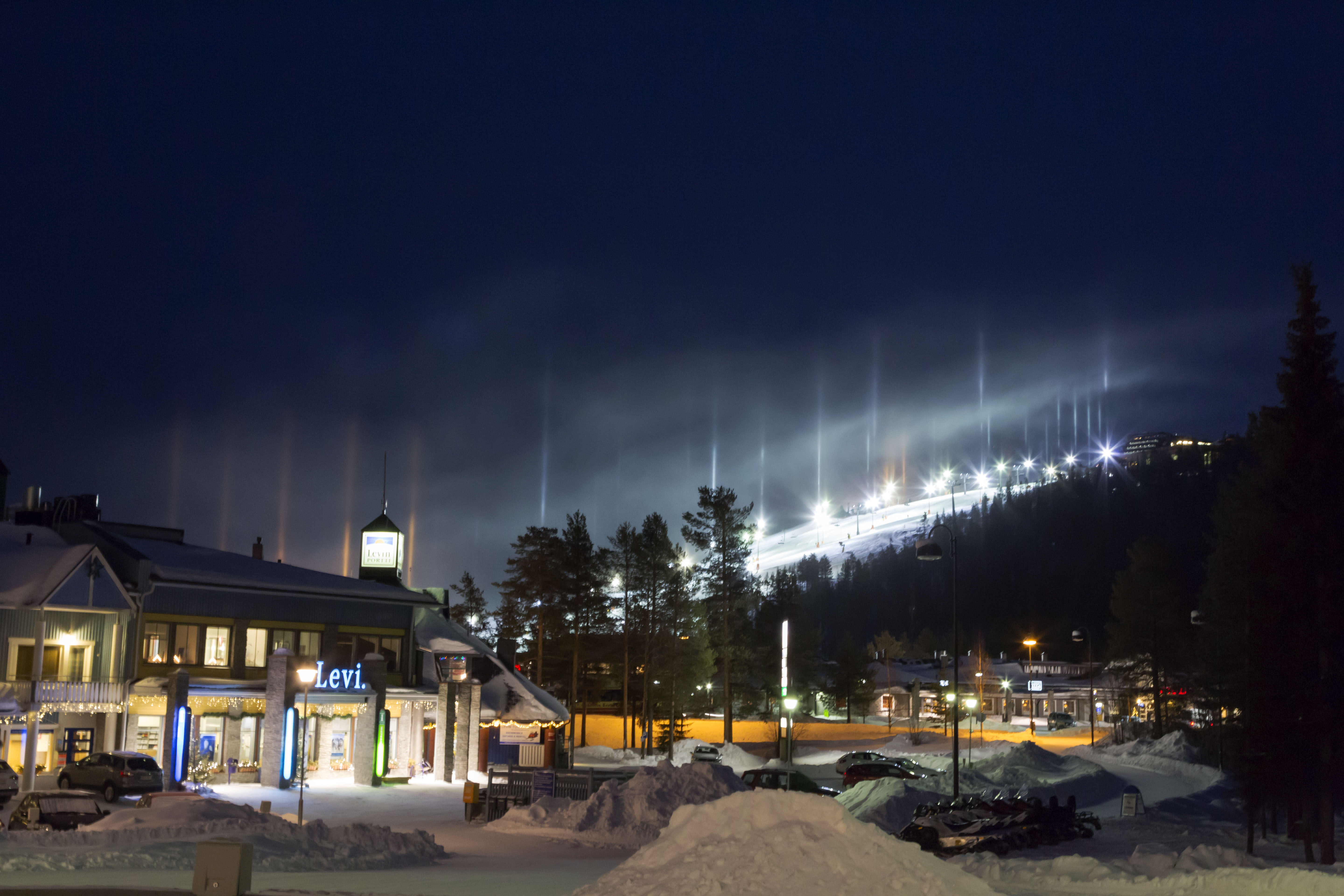 In Lapland hadden we uitzicht op de piste, in de lucht waren ijskristallen ontstaan die in het licht op de piste als strepen omhoog leken te gaan.