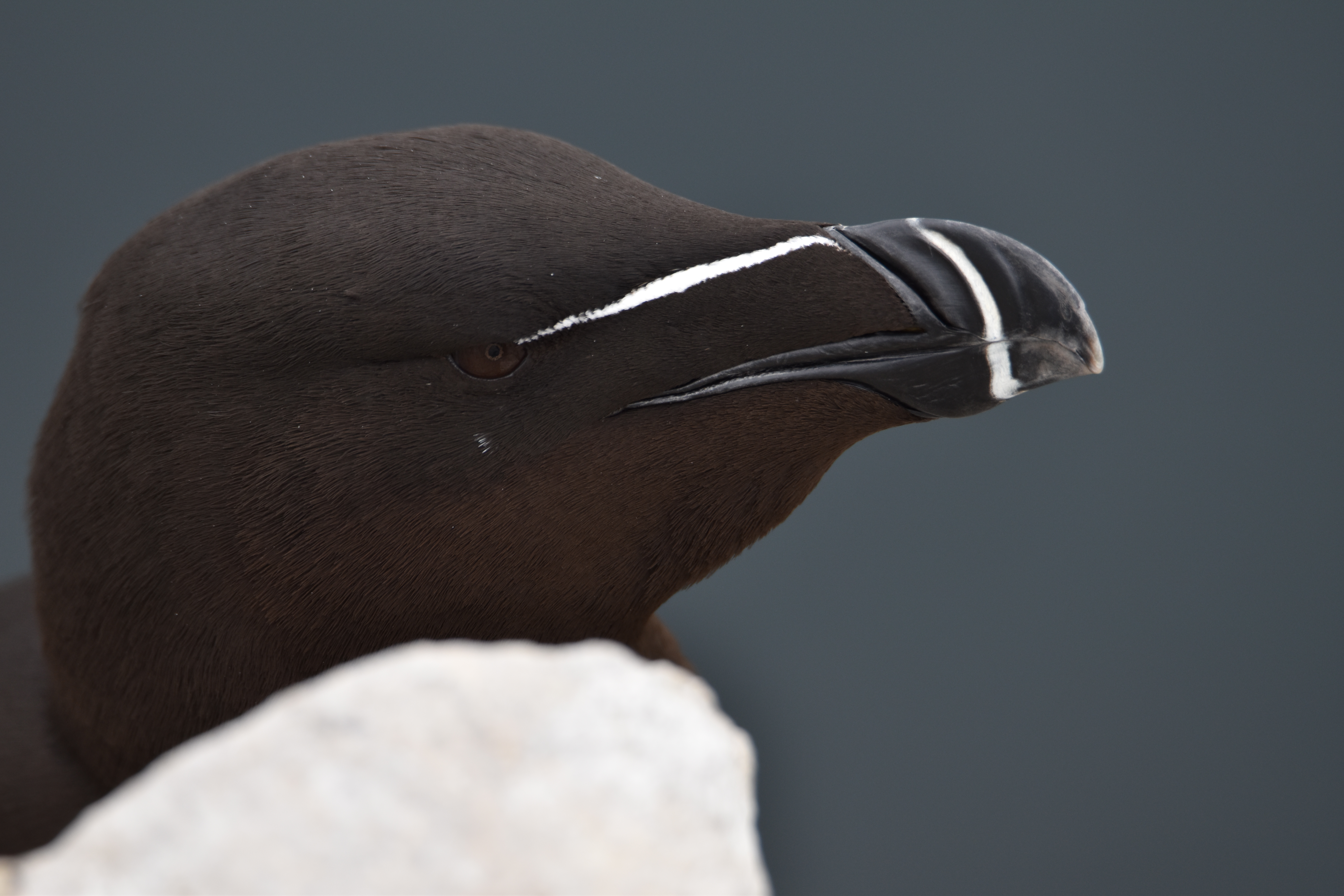 Een close up portret van een Alk waarin de prachtige tekening rond z'n snavel mooi te zien is
