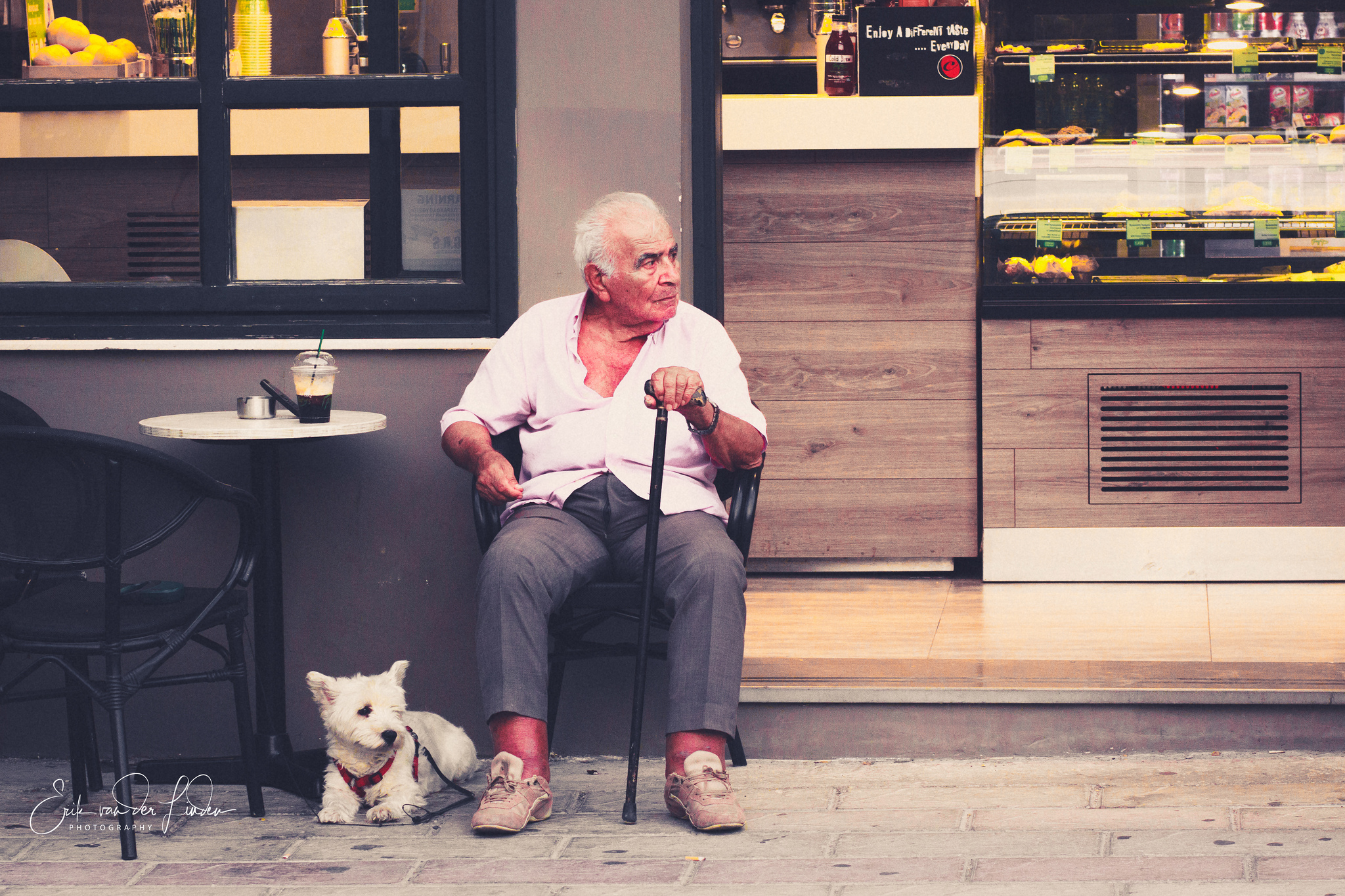 Een inwoner met zijn hondje aan de koffie, in het vakantiestadje waar ik verbleef op Rhodos.