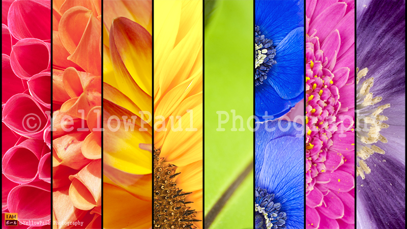 Rainbow collage of red orange yellow green blue pink violet purple colors of Dahlia Sunflower Fern leaf Anemone Windflower Gerbera and Poppy flowers in closeup separated with black strips
