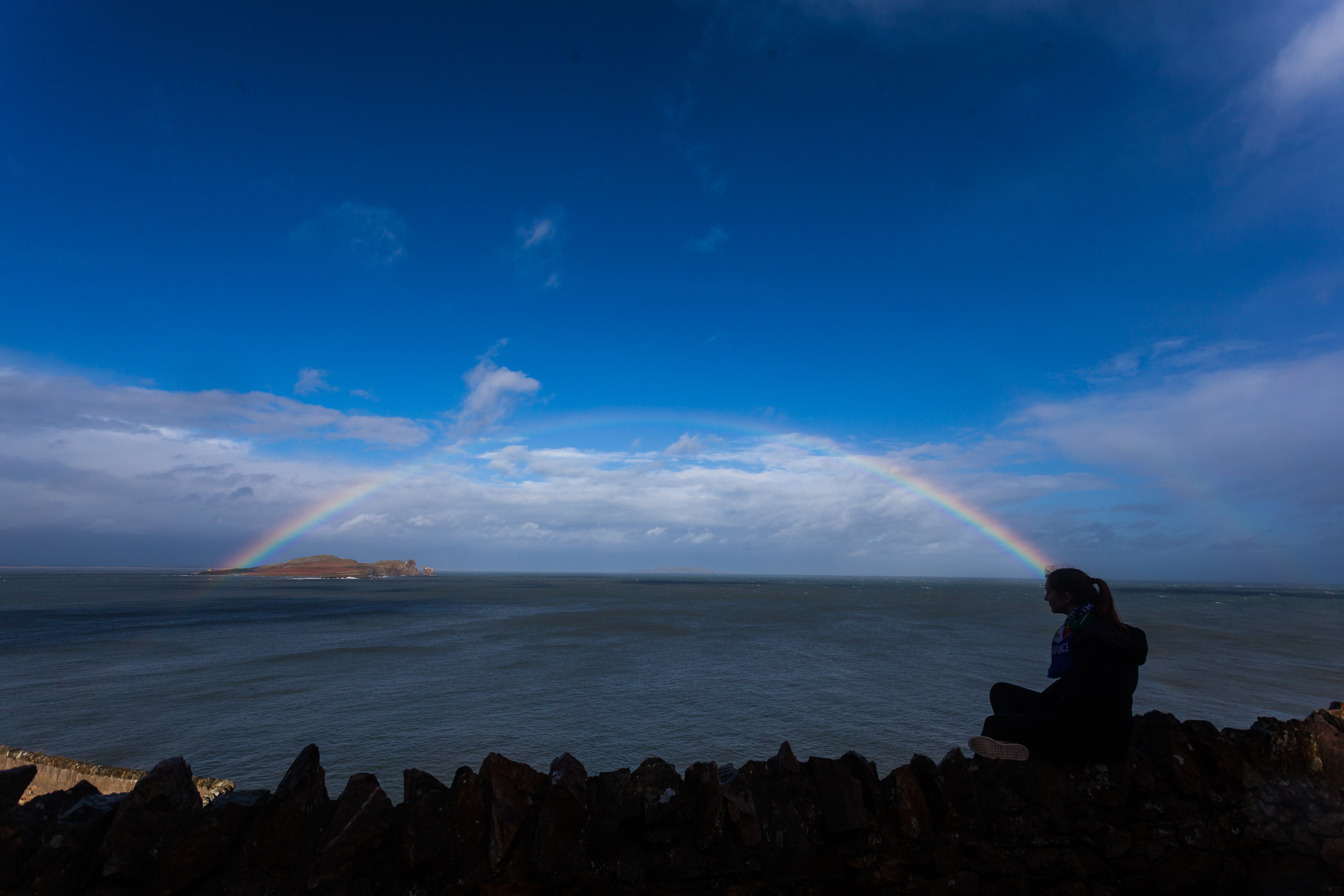 Connectie met een eiland door een regenboog tussen eiland en meisje.