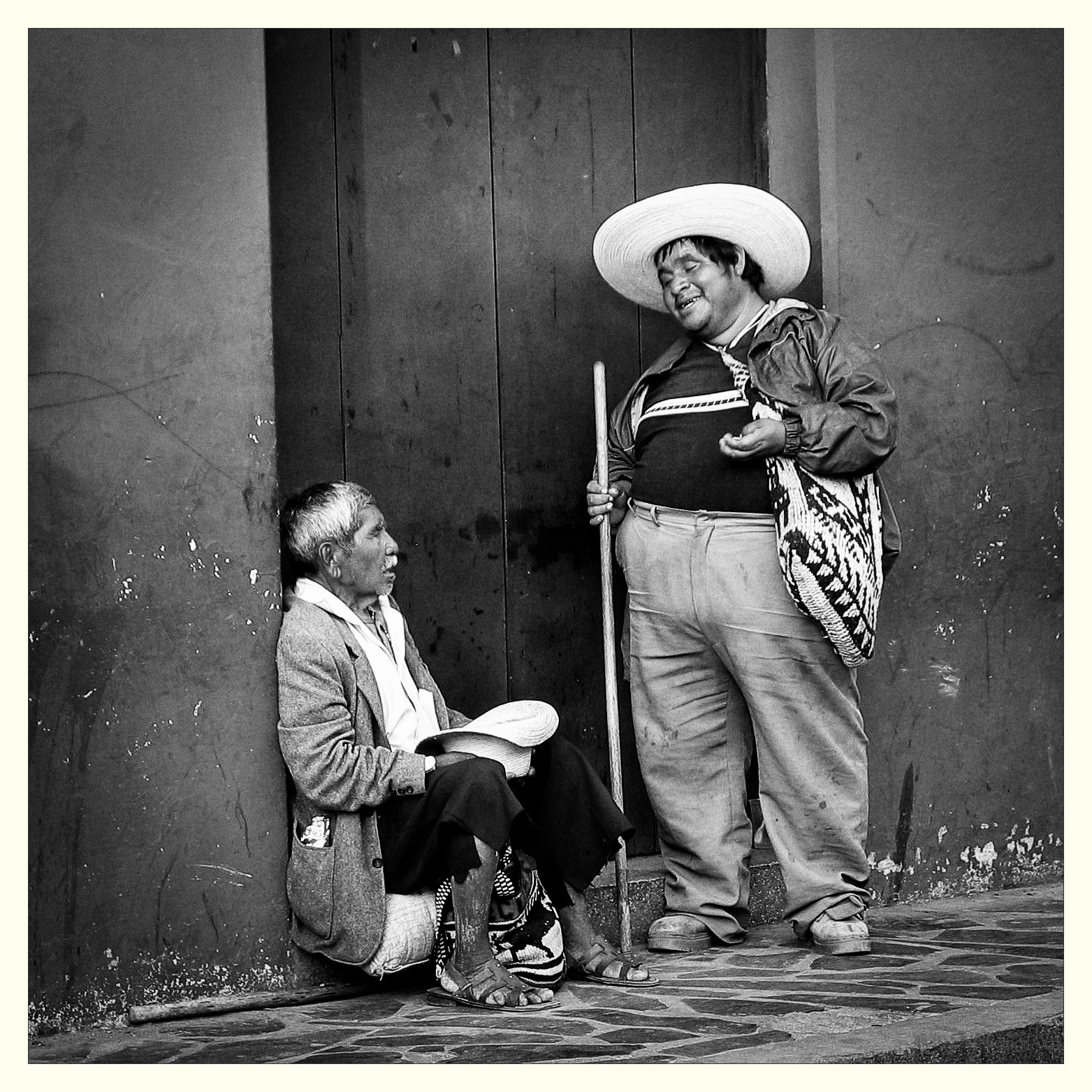 Straatgesprek tussen twee bedelaars in Antigua, Guatemala. Waar zullen ze het over hebben, over de vele toeristen, die maar niets willen geven en ze alleen maar gebruiken als schilderachtig foto-object? ;-)