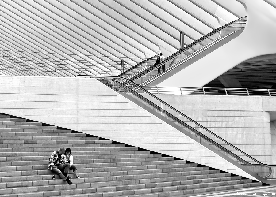 Een foto gemaakt bij het station Guillemins te Luik en omgezet in zwart-wit. Twee stellen zijn verwikkeld in een conversatie.