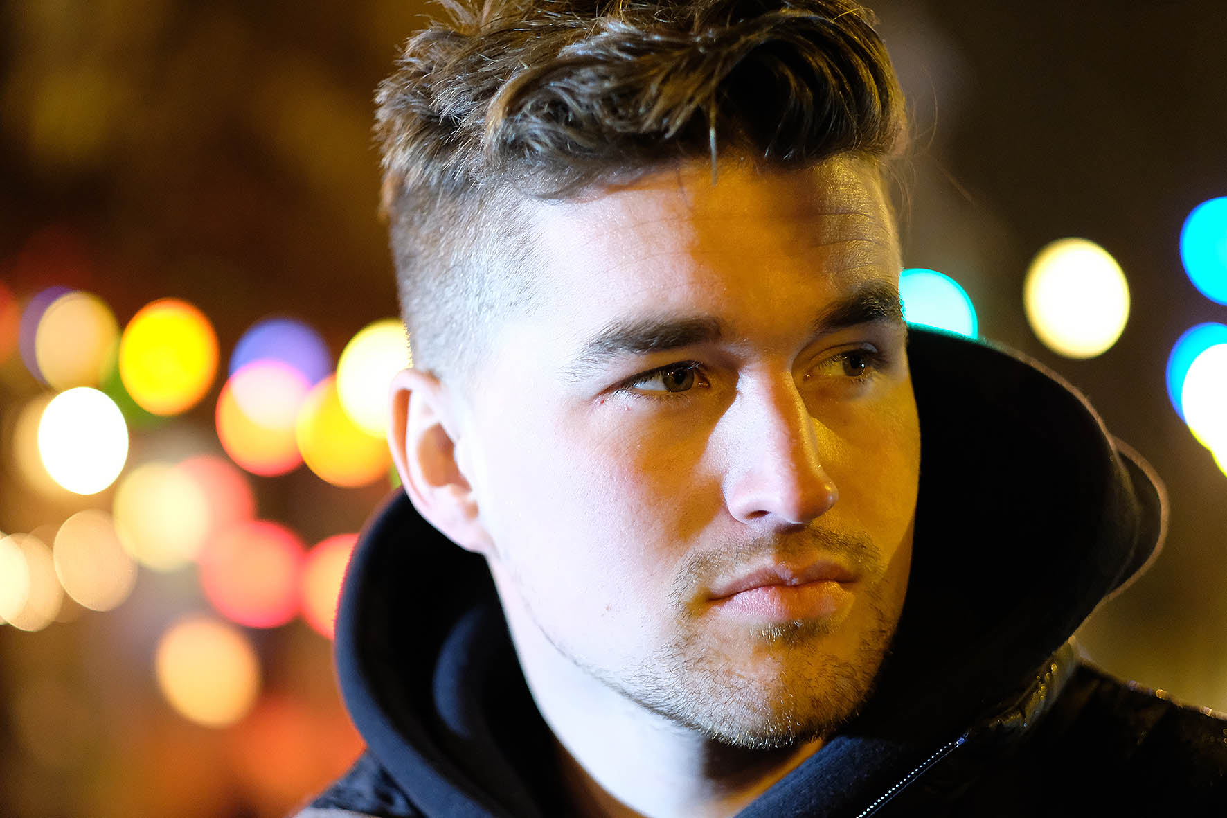 Deze foto is in Antwerpen gemaakt bij een café met buiten een slinger gekleurde lampjes. Door gebruik te maken van de Fujifilm XT-2 met de 56mm 1.2 APD-lens is er een mooi Bokeh-effect te bereiken