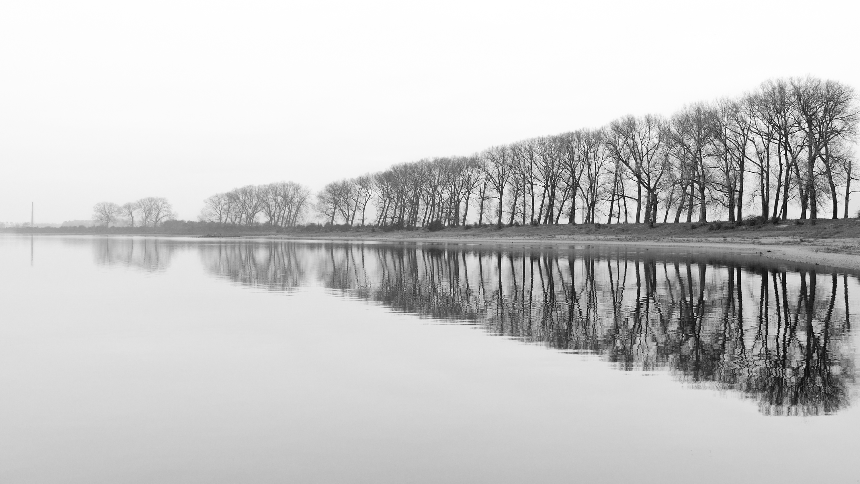 Bizonbaai, Ooijpolder bij Nijmegen. Kenmerkende elementen in het landschap zijn bomen, water en natuurlijk de schoorstenen van de (voormalige) steenfabrieken. Het perspectief en de weerspiegeling deden mij in deze zwart-wit compositie gelijk denken aan een muzikaal crescendo ;-)