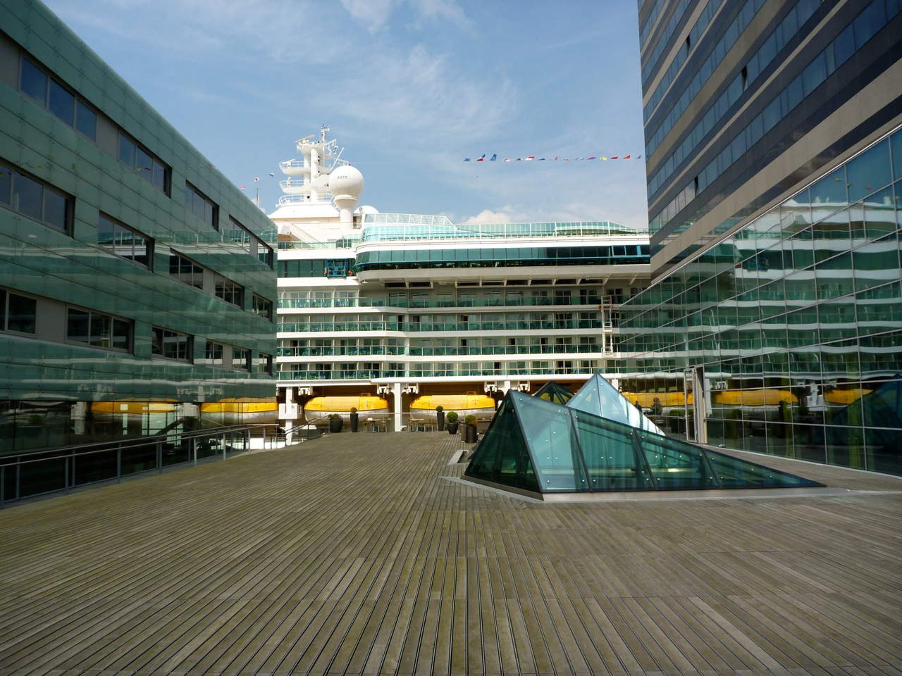 Cruiseschip in Amsterdam,tussen 2 gebouwen door.