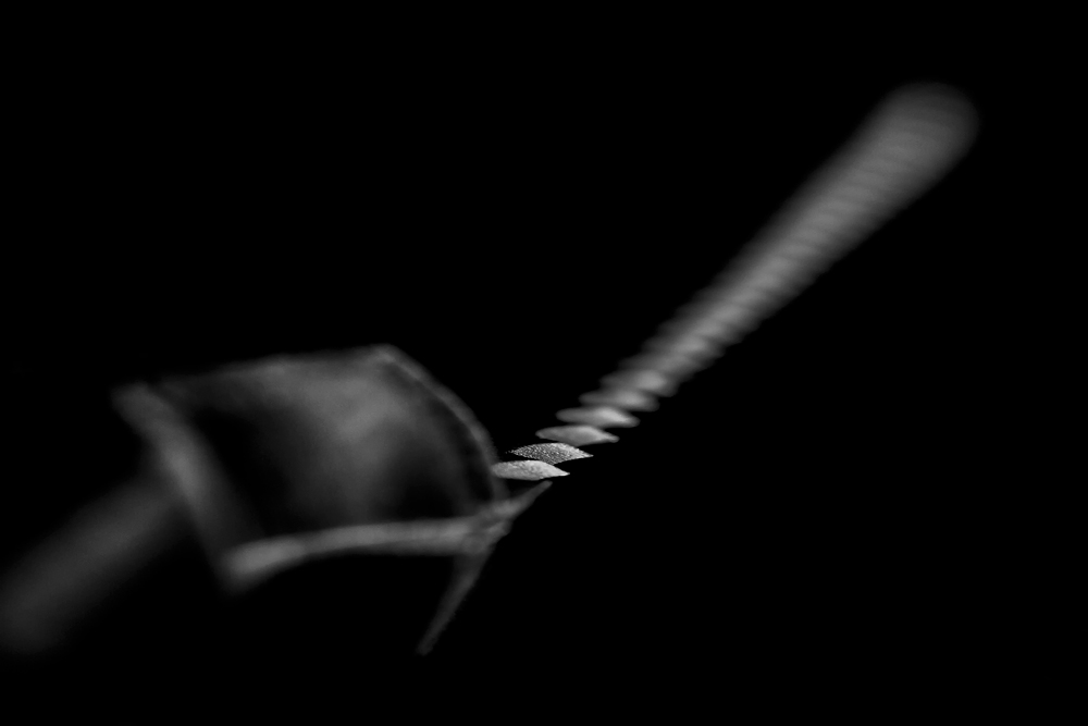 Wat je ziet is een deel van een broodmes gefotografeerd tegen een donkere achtergrond in een verduisterde kamer en verlicht met een zaklamp. In de CS6 RAW-converter al zoveel mogelijk het zwart naar voren gehaald en dit in photoshop met curven zwart pipet afgemaakt en tenslotte wat verscherpt met unsharp mask. Nog wat kleine ongerechtigheden weg gepoetst