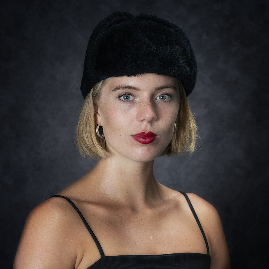 Studioportret van een jonge vrouw met bontmuts