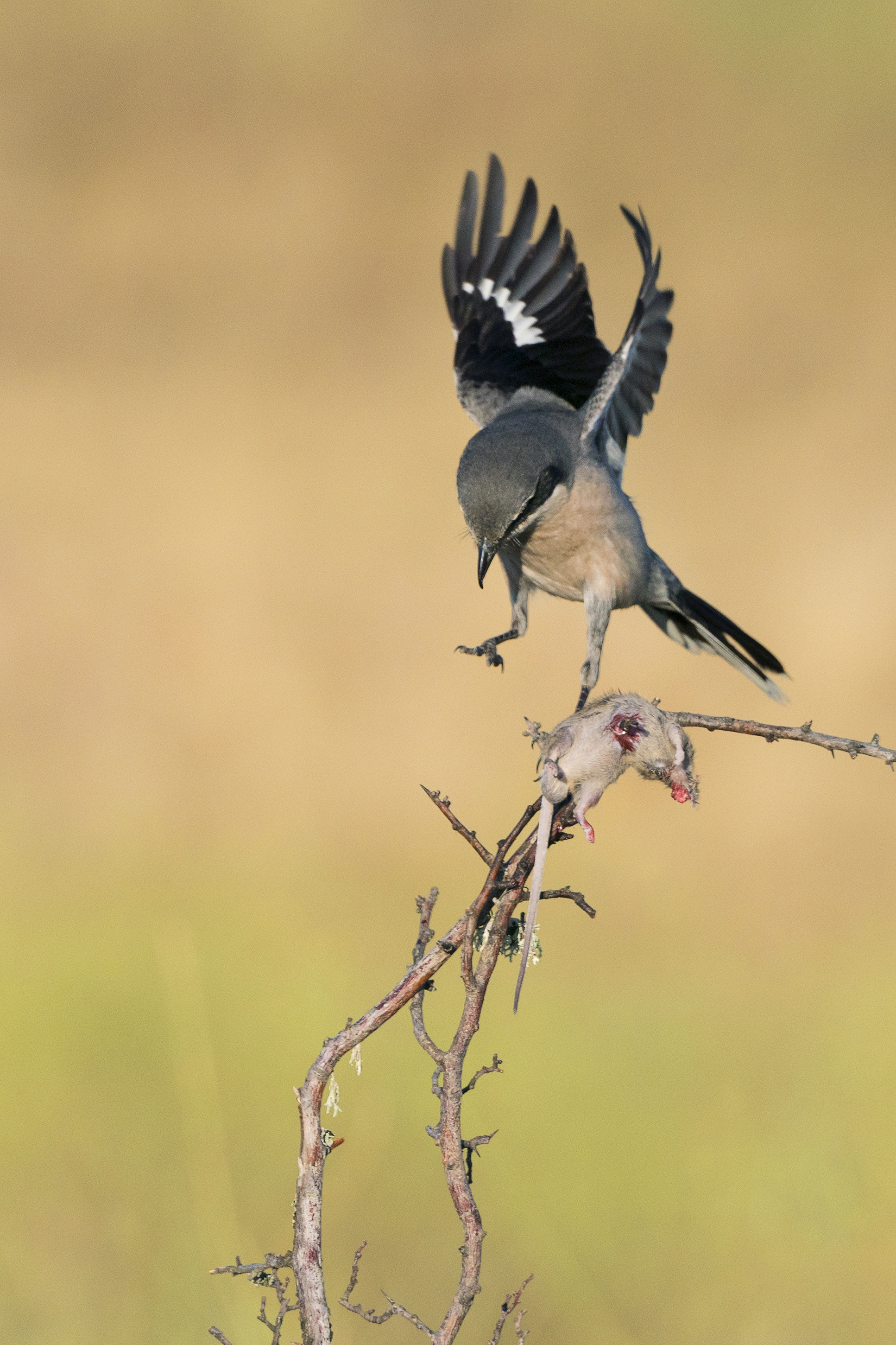 Deze klapekster lijkt net op zijn prooi te dansen.