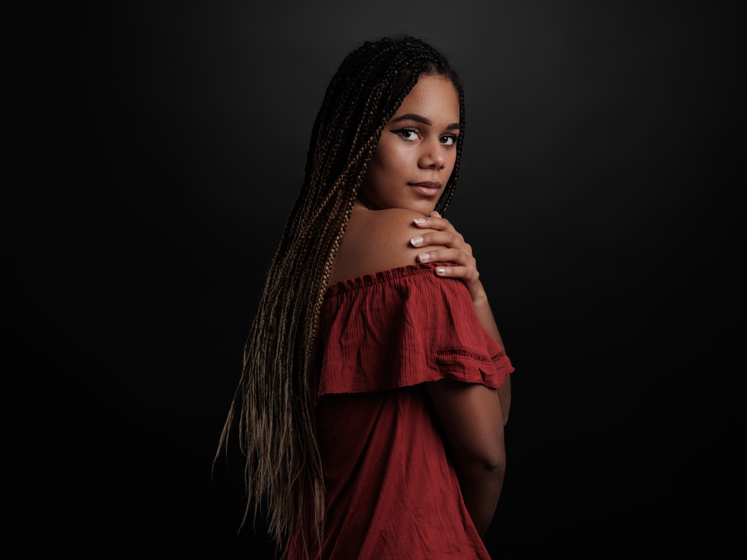 Portret met rode top en gevlochten haar.