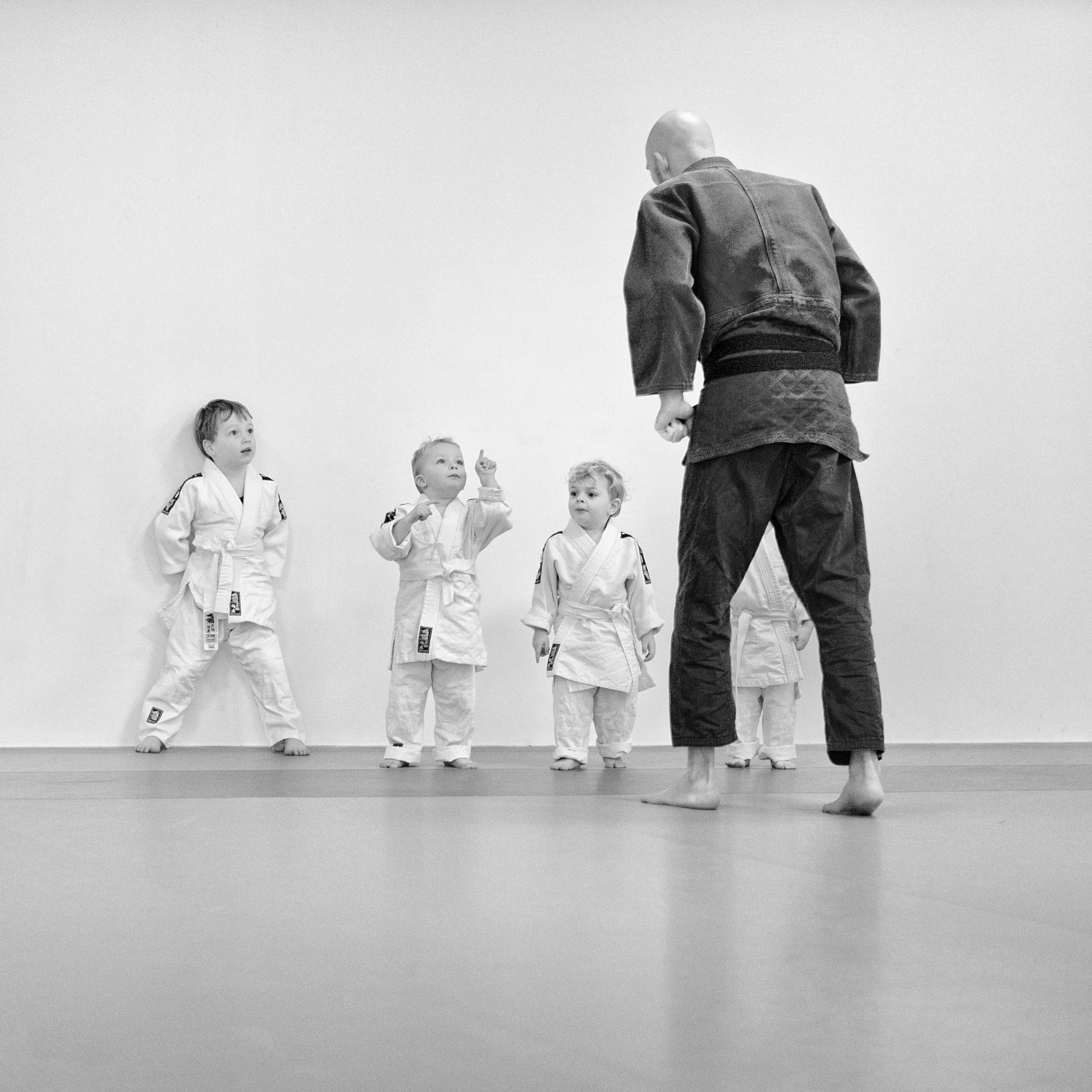 Peuter stoeien, Judo voor de allerkleinste. Een mooi moment tussen leraar en leerling.