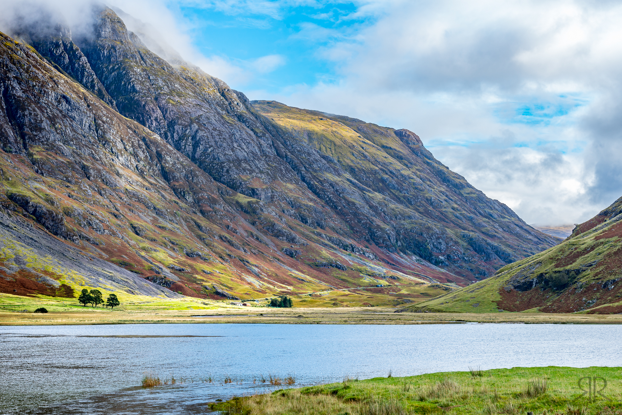 Foto genomen vanaf de westkant over Loch Achtriochtan bij vriendelijk weer