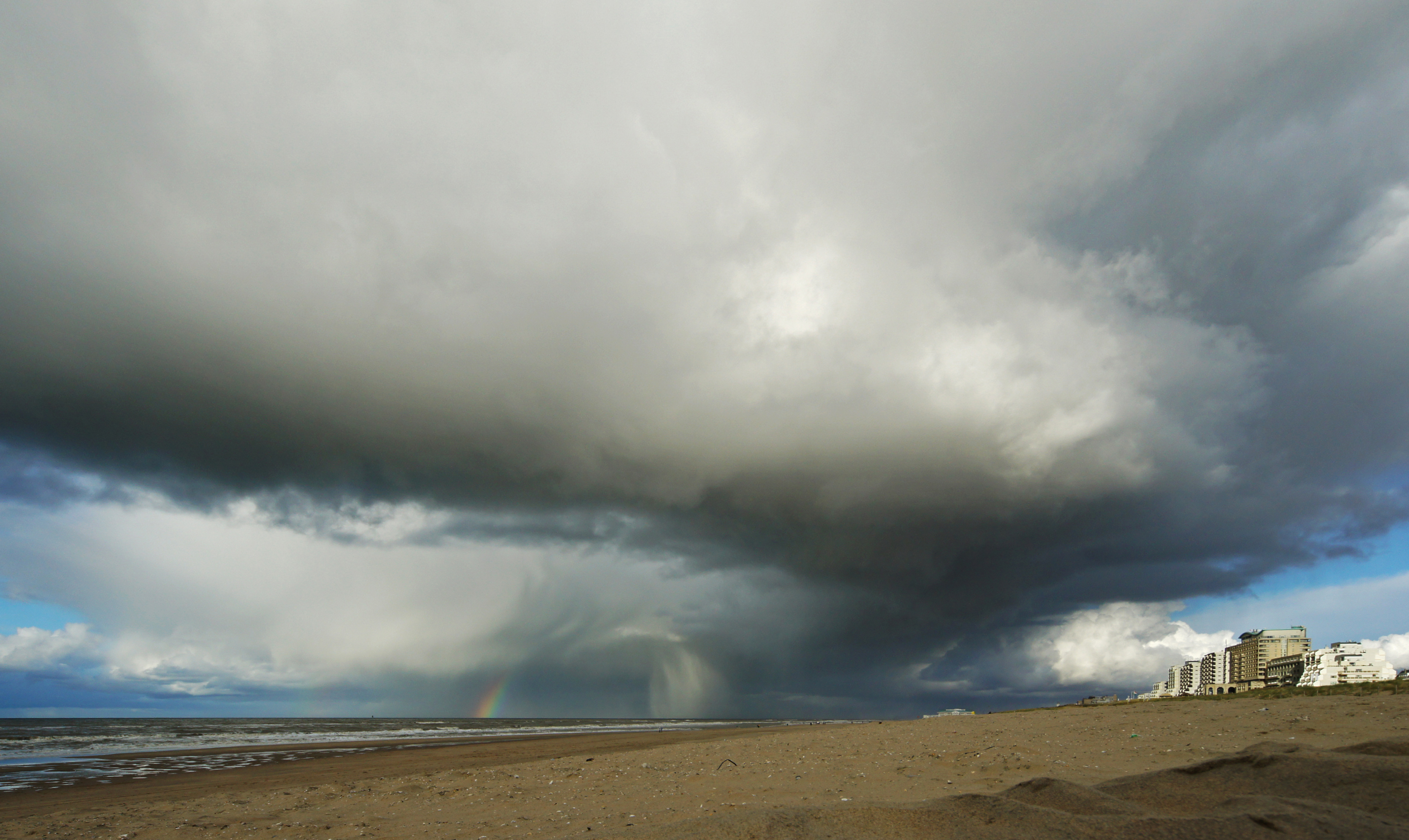 Deze enorme wolk was een voorbode voor zwaar weer boven de kust de regenboog was een cadeautje toen ik de foto maakte :-)