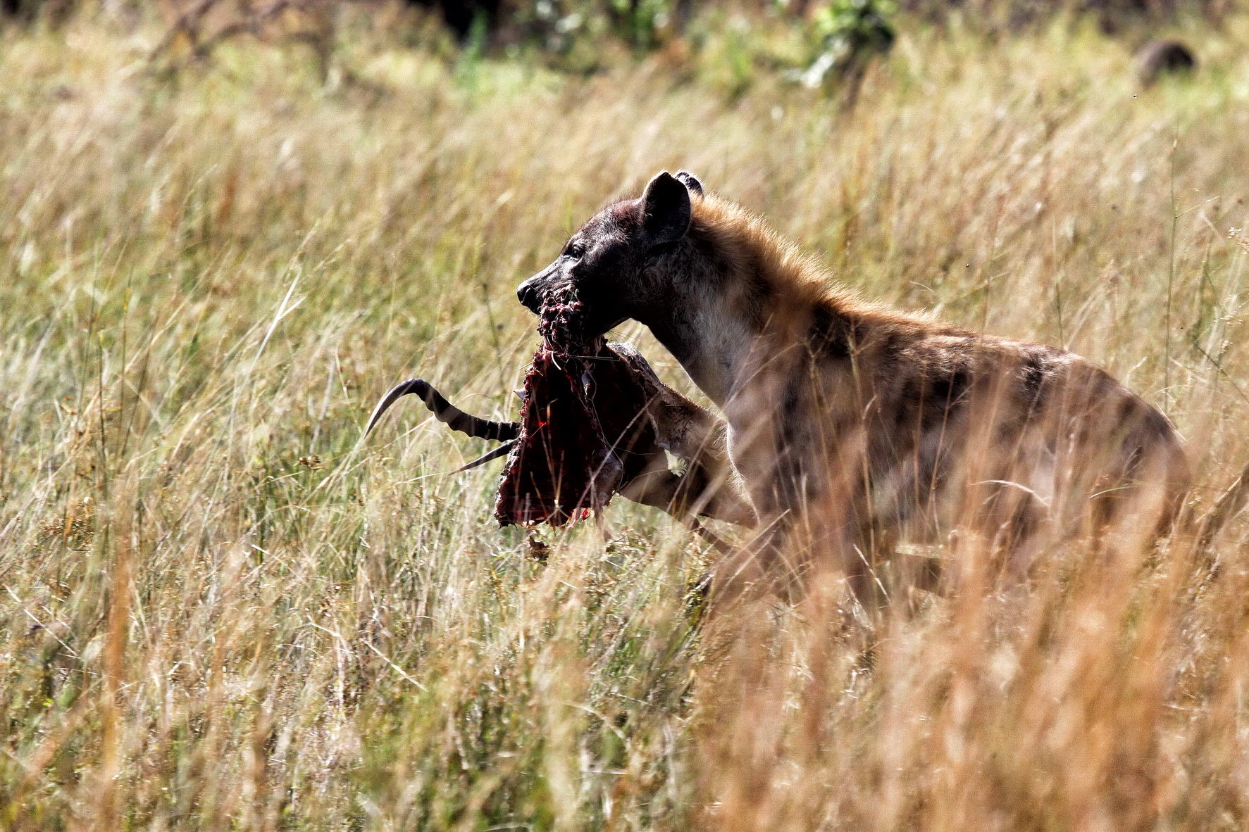 Hyena met buit in de Okavanga Delta in Botswana