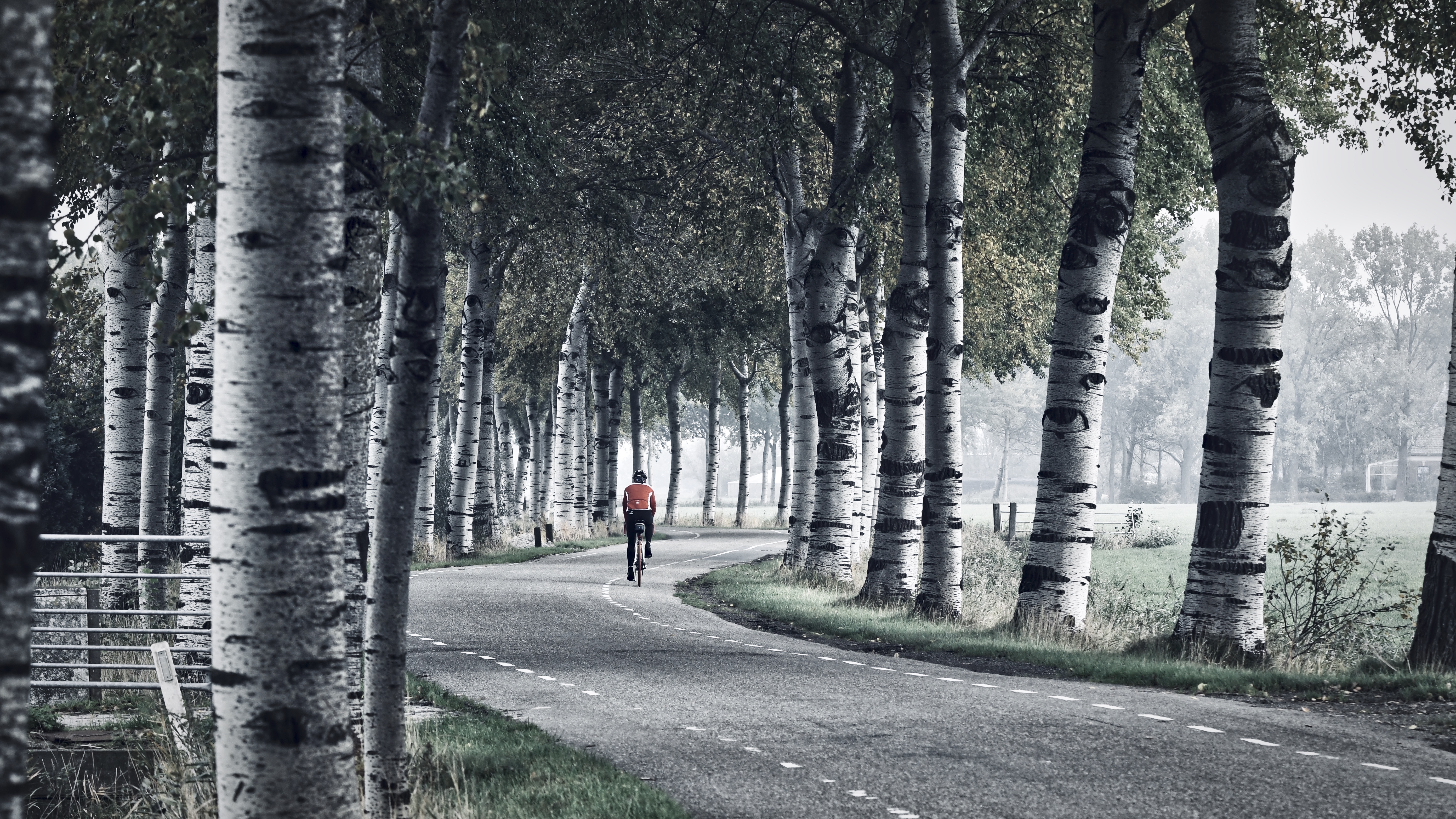 De eenzame fietser op een landweg net boven de stad Groningen. Het is stil zelfs de kleuren schreeuwen niet.