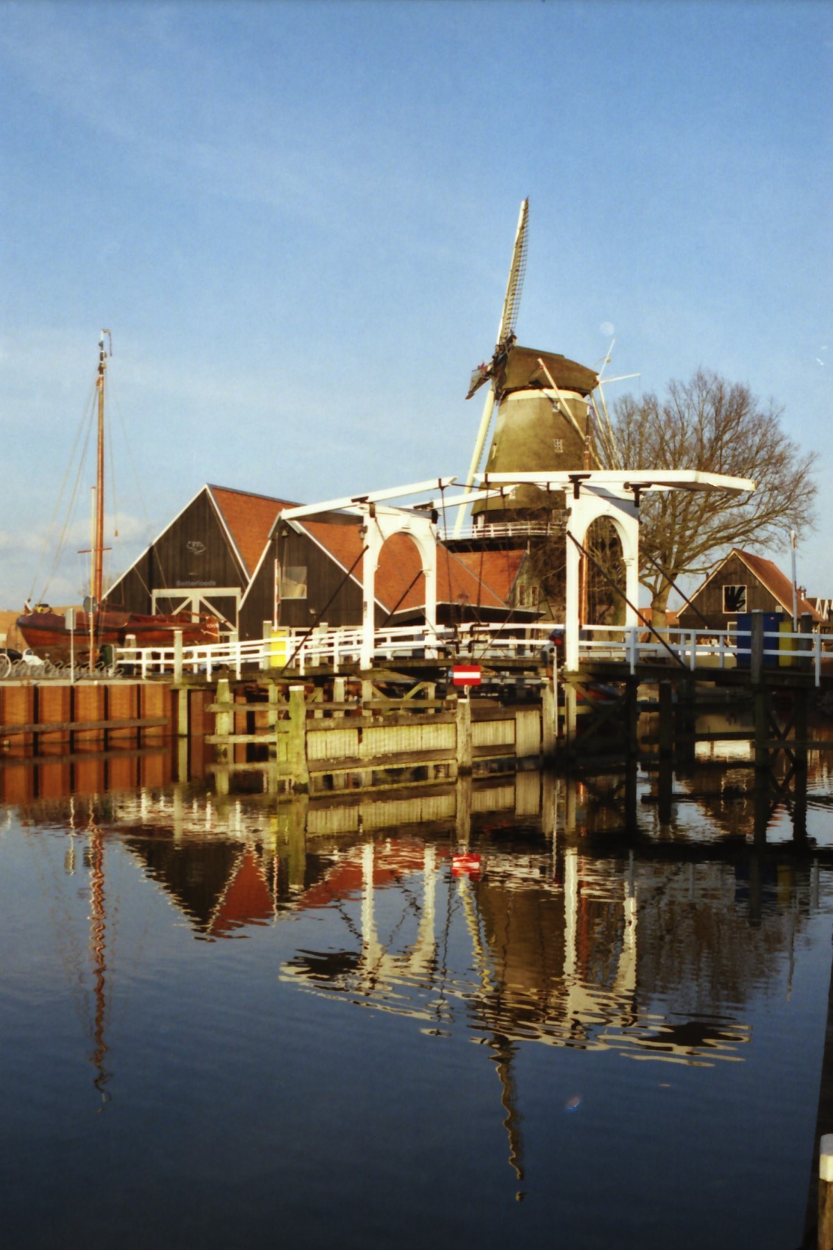 Ik heb deze foto gemaakt in de haven van Harderwijk. Menig toerist is al over het bruggetje gegaan om naar het Dolfinarium te gaan. De foto is een analoge foto die ik met mijn analoge camera Nikon F65 heb gemaakt