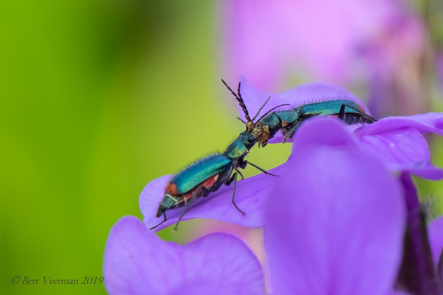 Twee prachtig gekleurde kevertjes op de al even mooi gekleurde Damastbloem , gezien het feit dat het twee dames zijn ga ik uit van een hartelijke begroeting