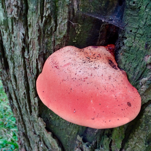 De prachtige rode biefstukzwam op een eikenboom.