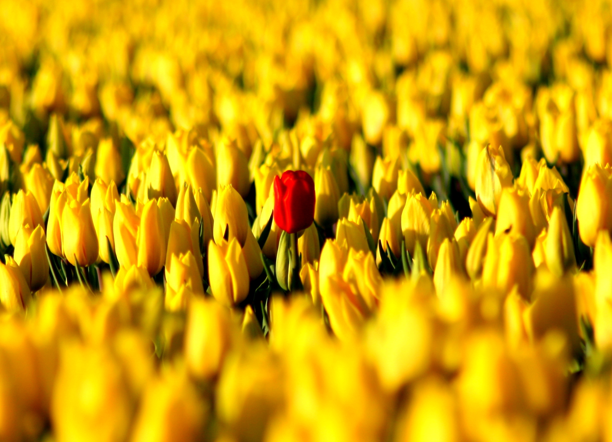 Deze rode tulp stond in een veld met gele tulpen; een mooi contrast.