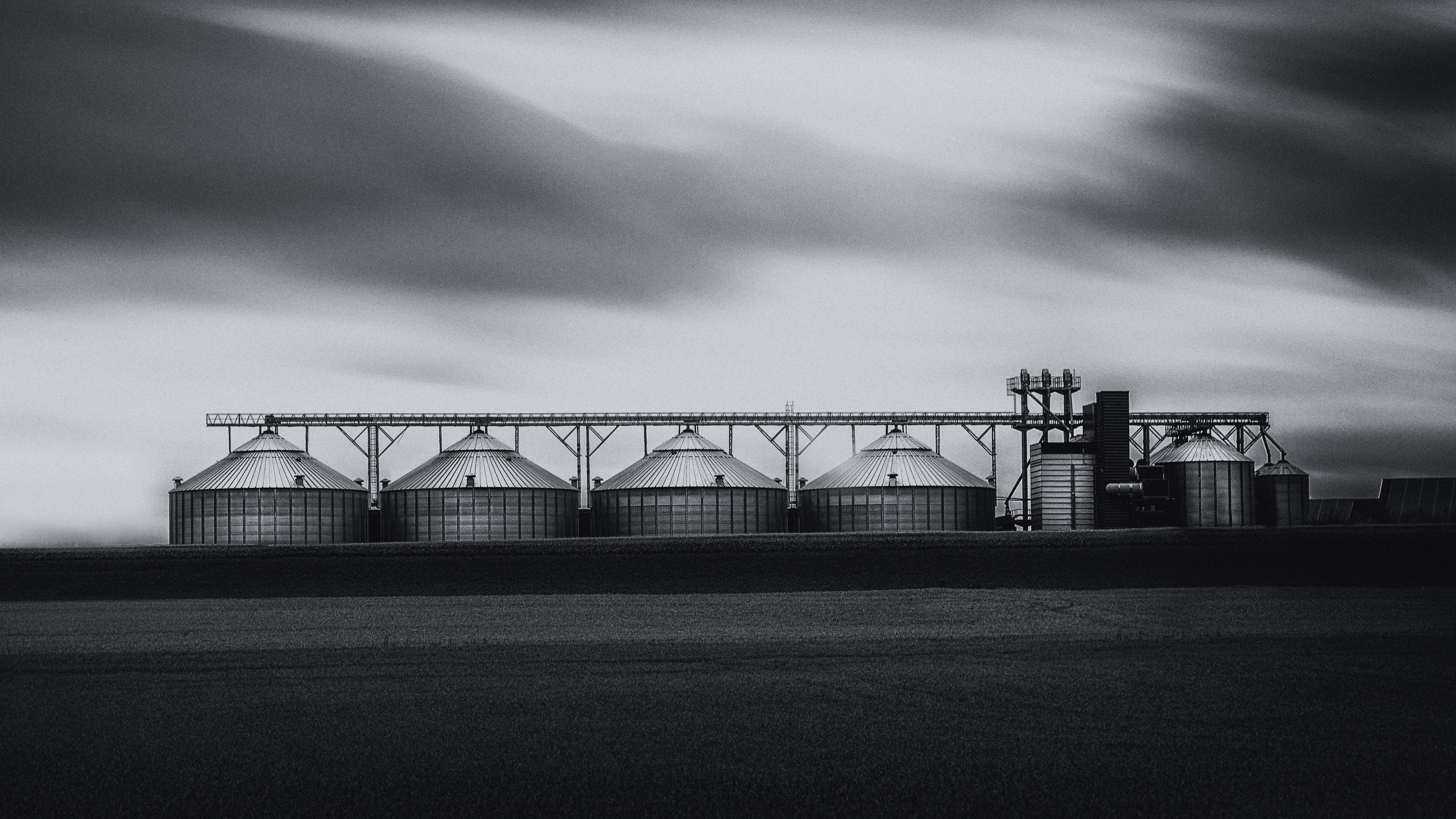 lange sluitertijdopname van een aantal aan elkaar verbonden silo`s in het veld.
