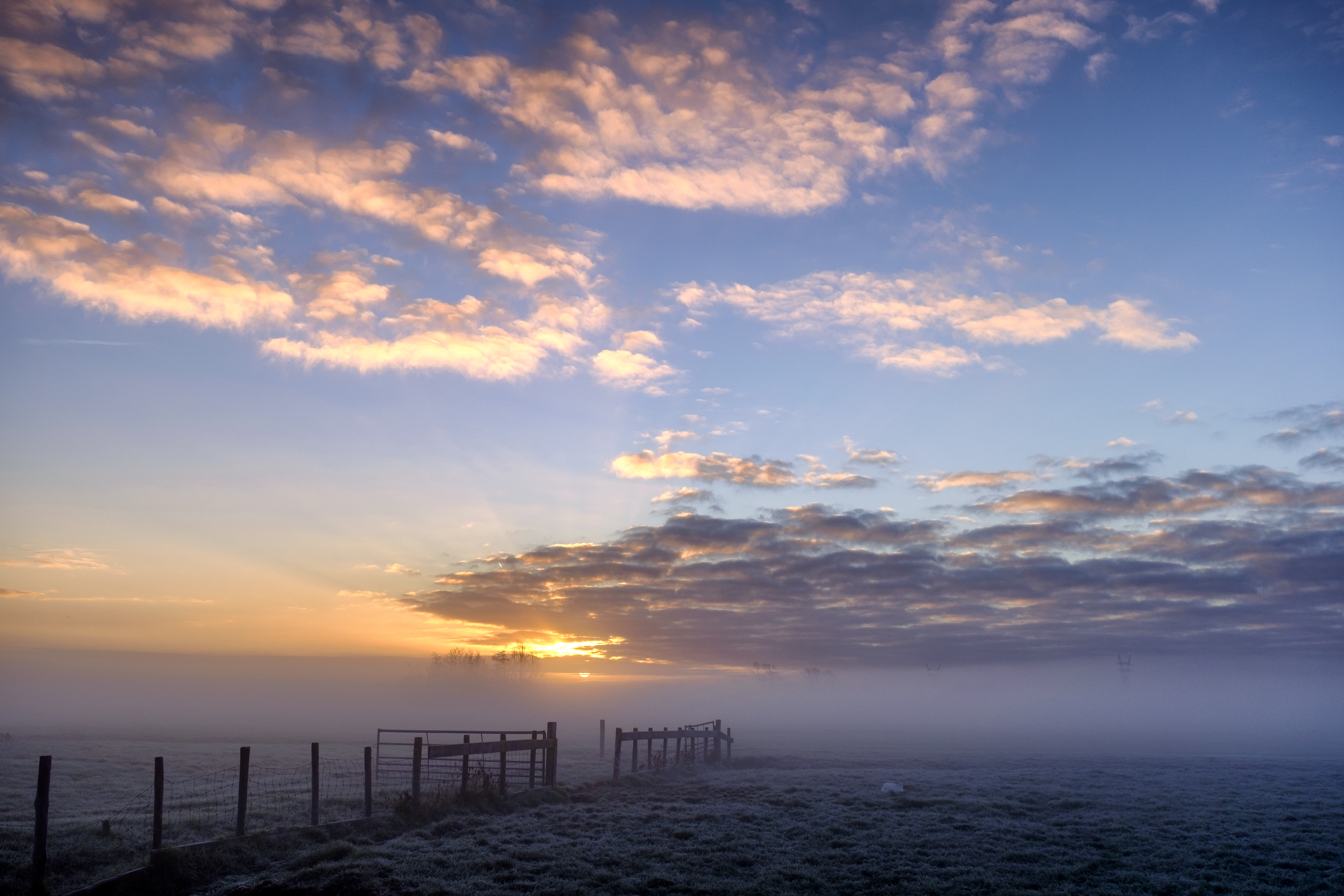 Genomen in de velden buiten Leiderdorp begin december. Vrieskou en mist, in combinatie met een paar wolkjes maakten een spectaculaire zonsopkomst.