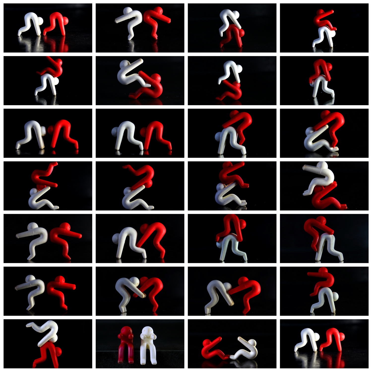 De taak van het rode en witte mannetje is simpel: ze moeten tegen etenstijd de deksel van de pan een stukje open houden, zodat de stoom kan ontsnappen. Dat is maar een half uurtje werken per dag, dus dat betekent dat ze heel veel vrije tijd hebben. Dan vermaken ze zich door acrobatische toeren uit te halen.