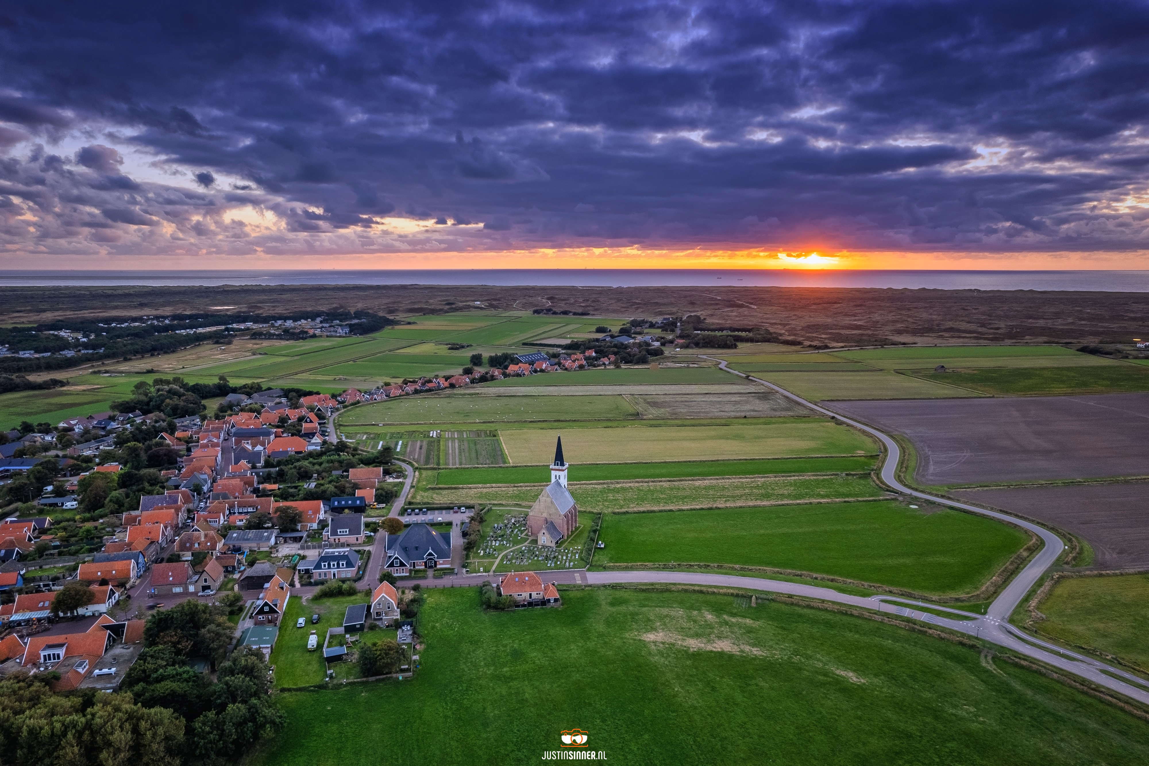 De zon piepte er nog net even doorheen. En Den Hoorn natuurlijk een zeer fotogeniek dorp! Mooi om te zien is dat aan de ene kant het dorp en aan de andere kant het slingerweggetje richting de zon gaat. Is het lijnenspel weer compleet. Fijne avond! #Texel #justinsinner #fotografie