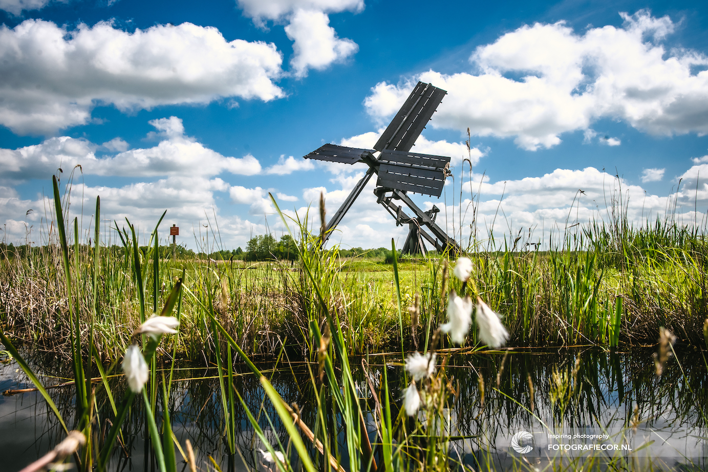 Een lief klein gemaal molentje die je vooral in de kop van Overijssel tegenkomt en Friesland. Het voorziet veengronden en kleine percelen van water en is een heerlijk onderwerp om te fotograferen. Vroeger waren er meer dan 30 van zulk vergelijkbare molens maar door de bouw van een gemaal nabij Vollenhoven verdwenen ze stuk voor stuk naar de 3/4 de er volgens mij nu nog bekend zijn. Op de voorgrond zie je de veenpluis wuiven in de wind als een katoenachtig plantje langs te waterkant. Vroeger werd deze pluis verzameld voor het gebruik als vulling voor kussens maar door zijn voorkeur voor slappe moerasgrond zal menigeen diep weggezakt zijn in de diepe modder.
