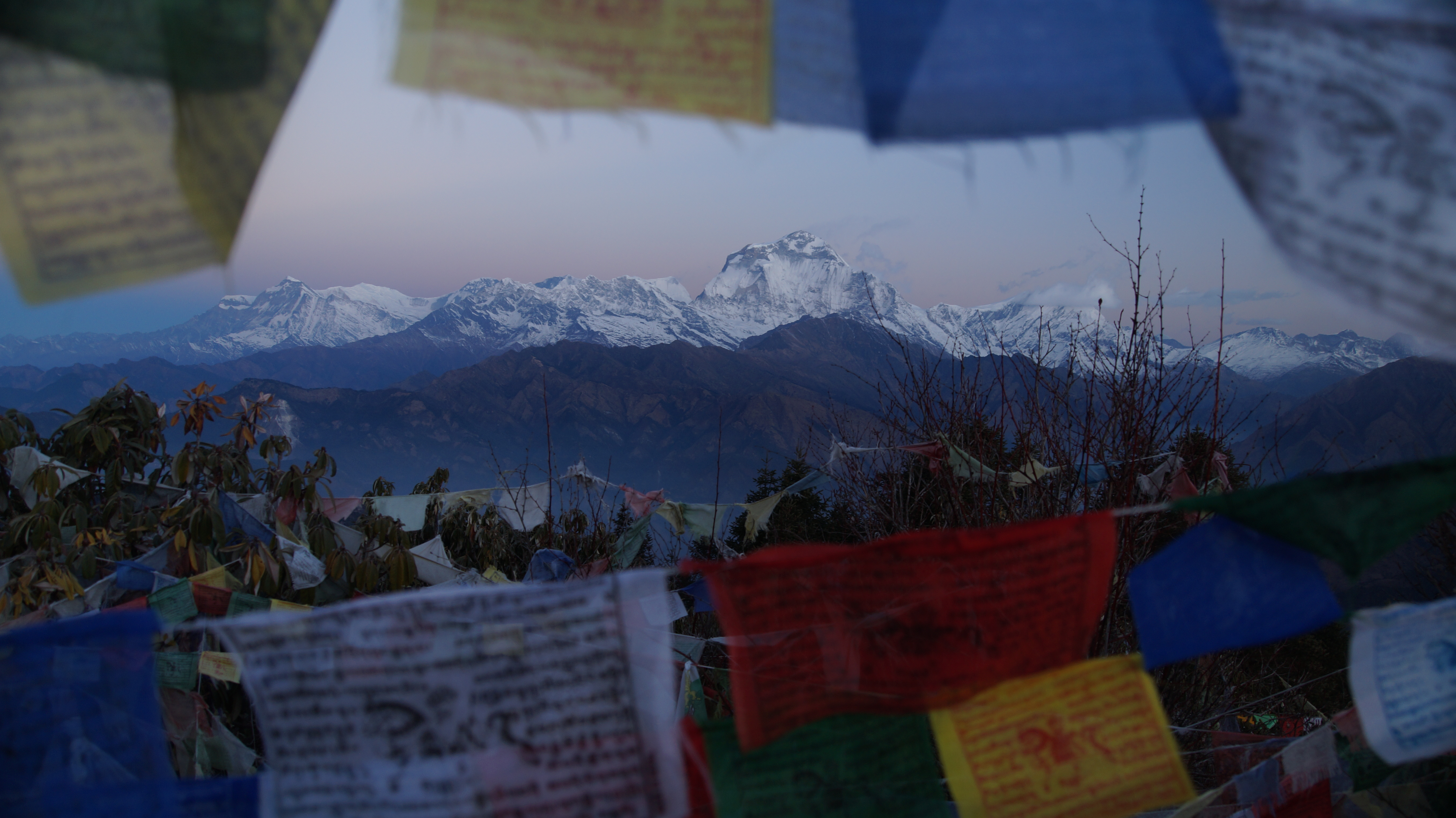 Een reus van de Himalaya's kil en koel, maar dankzij de zonsopgang en de kleurige gebedsvlaggetjes wordt de berg gehuld in een warm jasje.