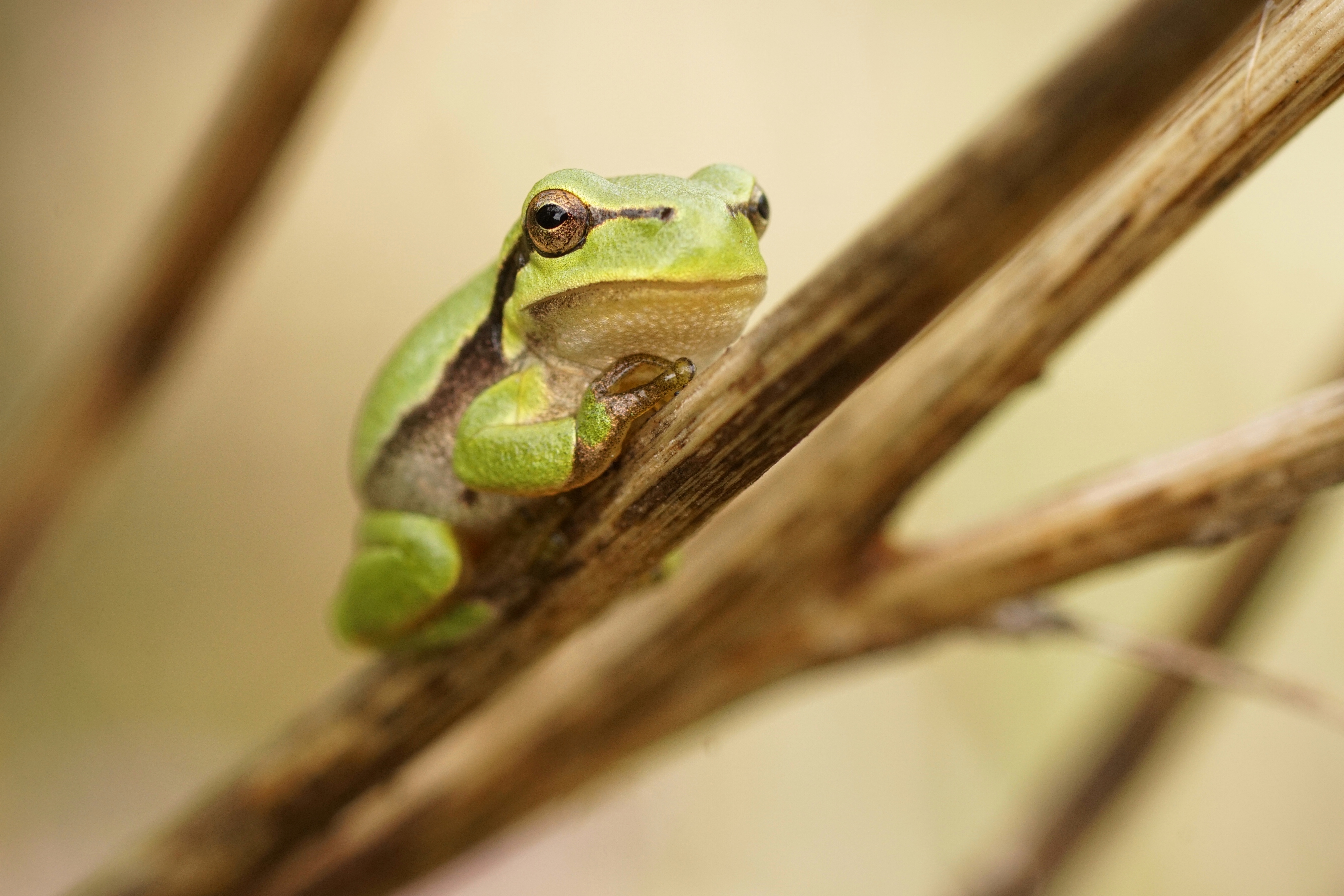 De boomkikker kleurt hier fraai bij de diagonale takken