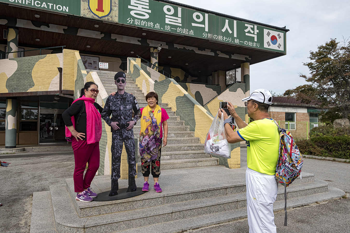 Toeristen poseren met kartonnen militair bij het bezoekerscentrum van de gedemilitariseerde zone aan de Zuid-Koreaanse kant