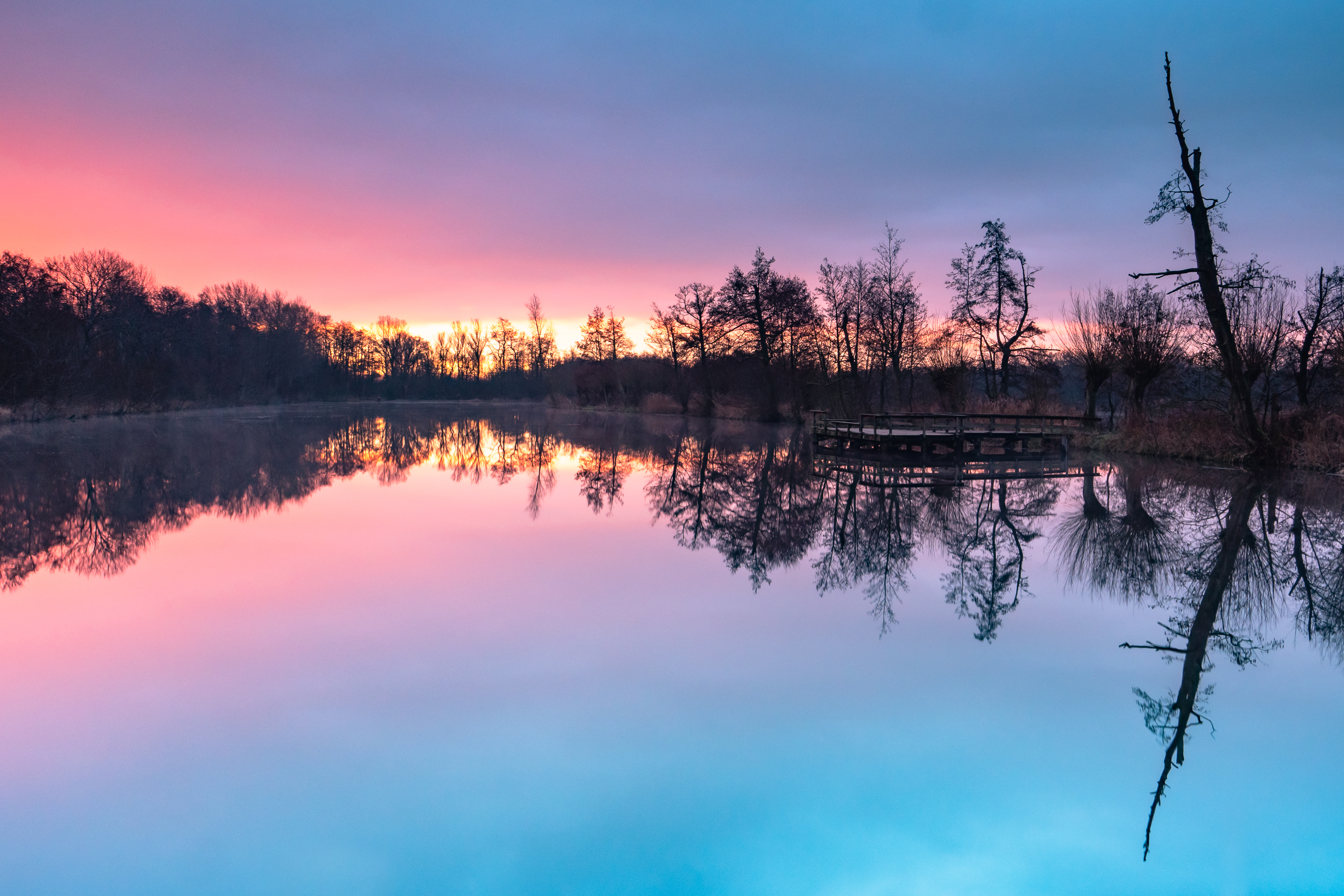 Het is donderdagochtend omstreeks 06:45. Het beloofde geen mooie dag te worden vandaag en de lage bewolking was dan ook een hint met een koevoet, maar het was nog droog met een kleine opening en achter de bomen kwam de zon dan ook even te voorschijn om vervolgens weer op te gaan in de grijze natte wolken...
