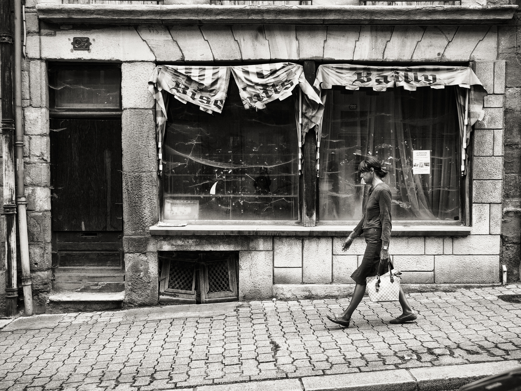 Deze vrouw in Autun zal haar heil elders moeten zoeken. Deze winkel is al paar jaar gesloten zo te zien.