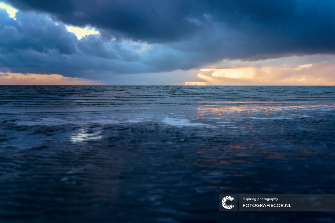 Het laatste zonlicht priemt nog net door de stapelwolken terwijl de avond begint te vallen over de immense weidsheid van de Wadden