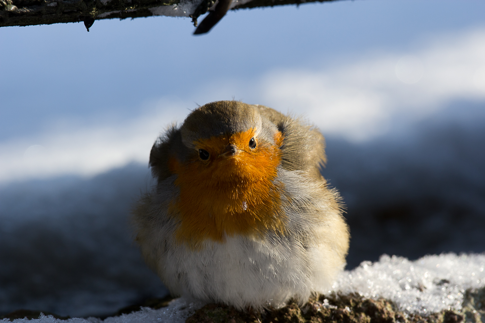 Dit roodborstje had zijn veren helemaal uitgezet om zodoende warm te blijven. Dus in plaats van een mooi rank roodborstje kwam ik deze donzige pluizenbal tegen. Tijdens het 'poseren' kijkt hij ook nog eens erg stoer de wereld in, geweldig.