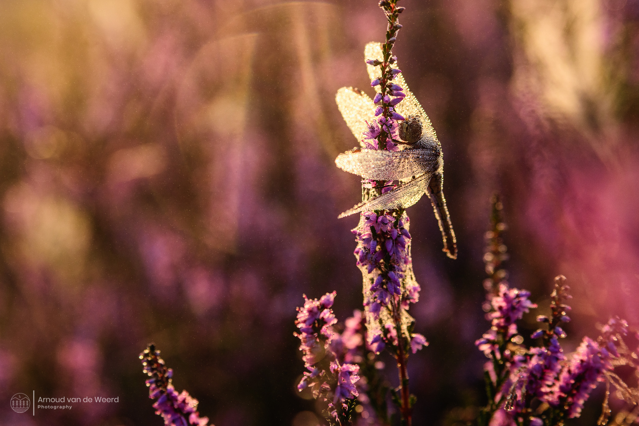 Net toen ik op het punt stond de heide te verlaten, zag ik deze prachtige libelle. Helemaal geweldig hoe het bedekt is met alle dauwdruppels.