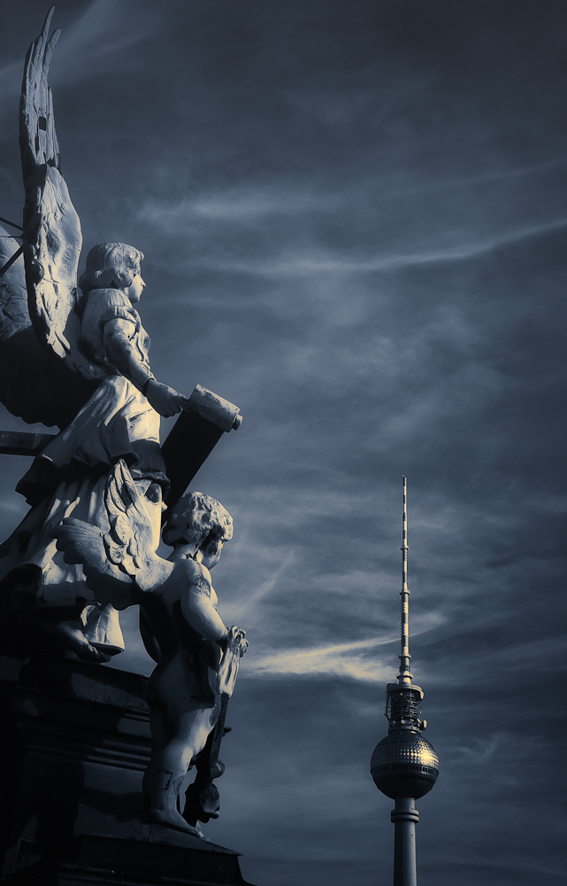 Uitzicht vanaf de Berliner Dom. Door de bewerking van het beeld wordthet beeld van deze Berlijnse iconen gedramatiseerd.