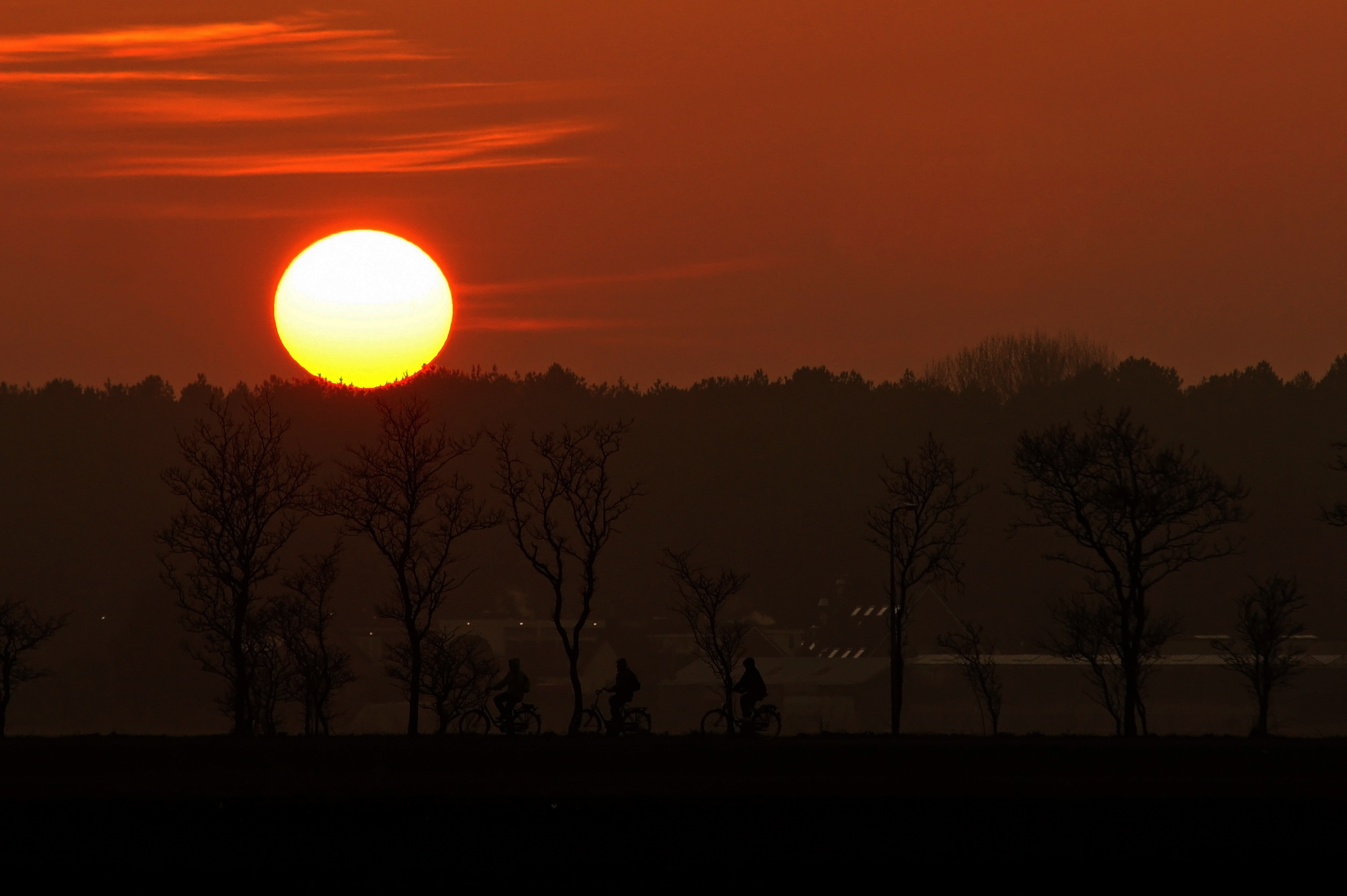Drie fietsende silhouetten tijdens de zonsondergang op weg naar huis
