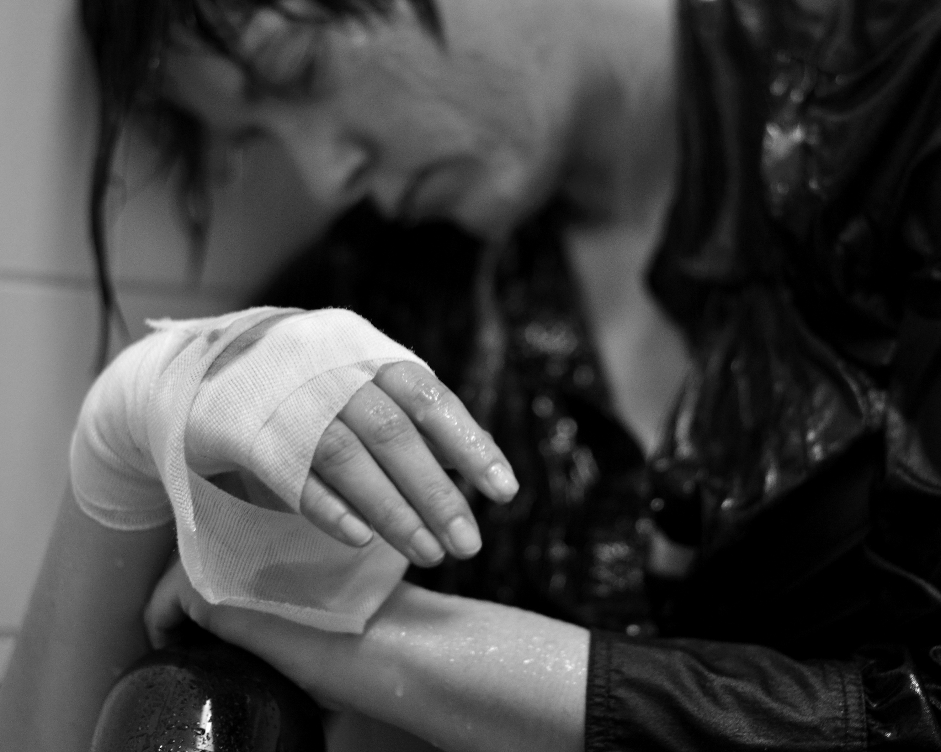 in scene gezet, onder de douche, fles whisky, verband en ketchup