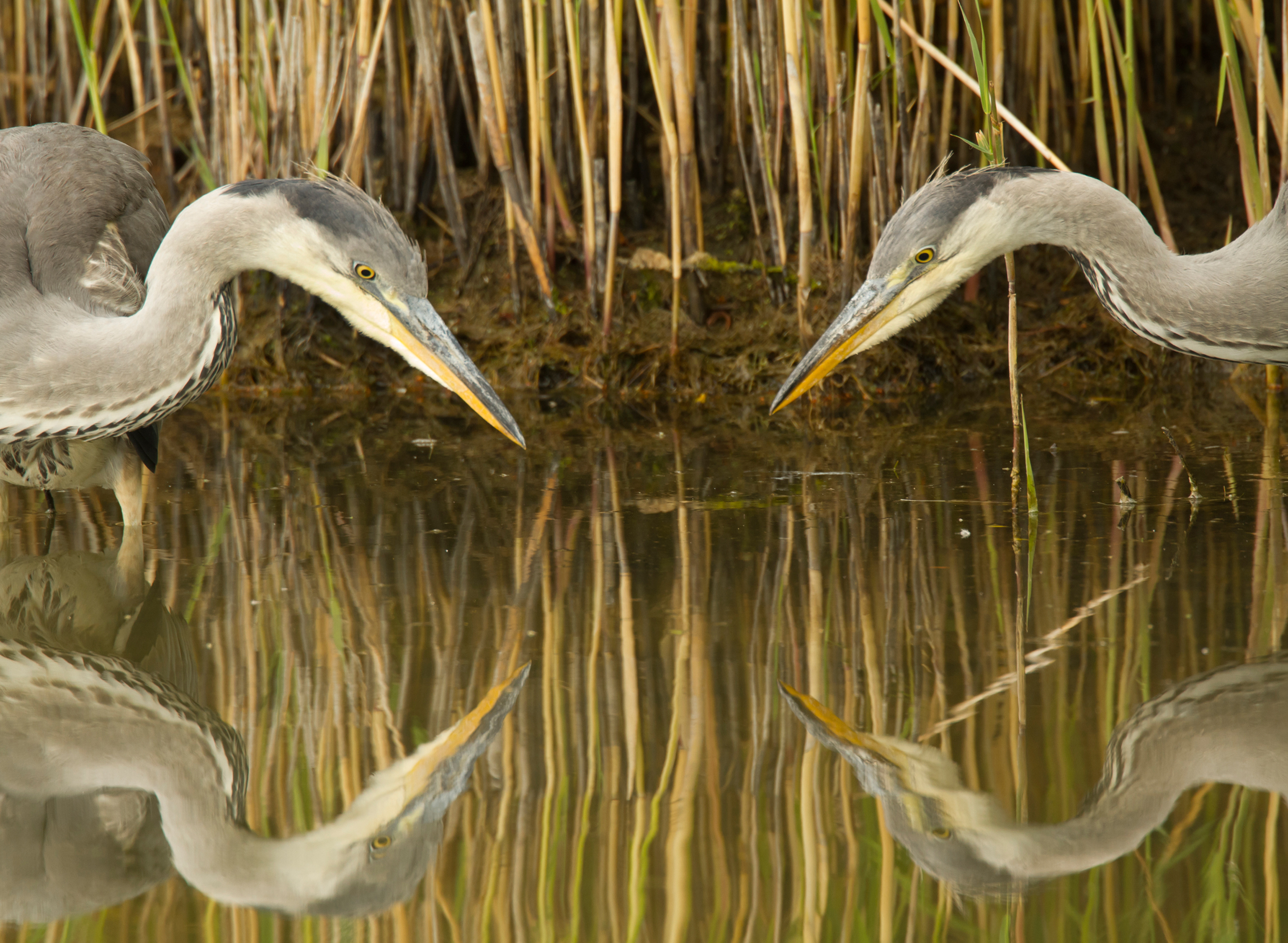 Twee jonge blauwe reigers die het op dezelfde prooi gemunt hebben!