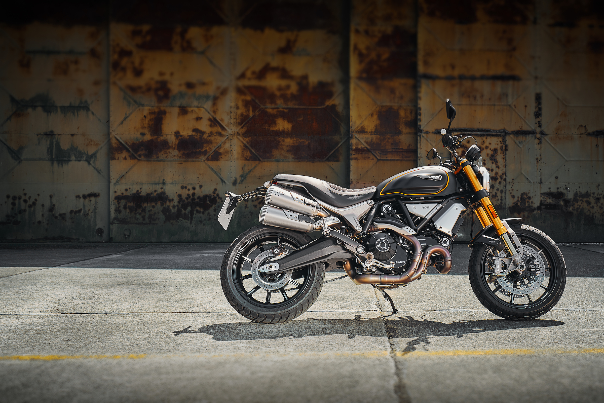 Een productfoto van een Ducati Scramber 1100 Sport, tegen verroeste poorten van een hangar...