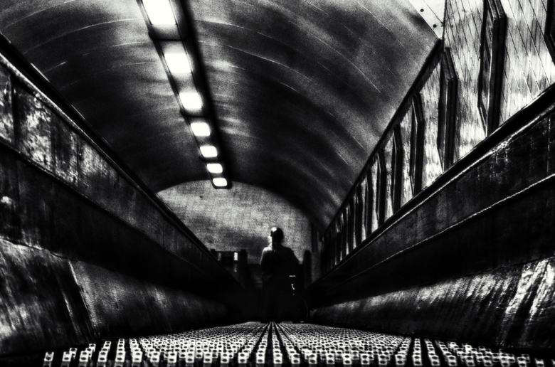 de houten roltrap uit 1933 Sint Annatunnel voor fietsers en wandelaars onder de Schelde door. Antwerpen
