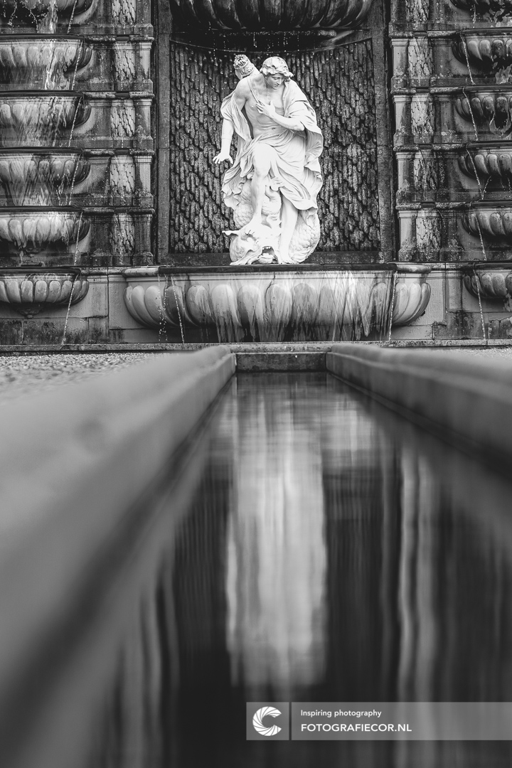 In het water van de fontein zelf lukt het je niet om dit verhaal vast te leggen. Als je echter midden in de tuin gaat staan en met meer afstand kijkt naar dit beeld kom je opeens tot deze verassende verhaallijn.