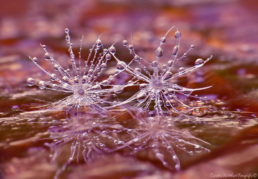 Twee pluisjes met druppeltjes drijvend op water.