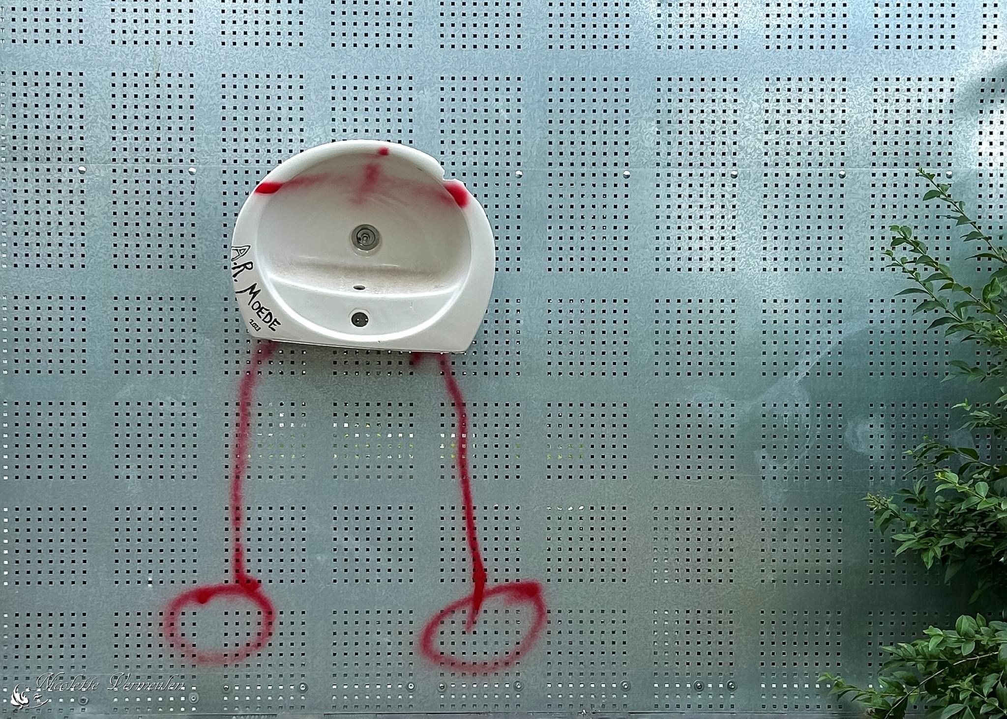 Deze oude wastafel wordt gebruikt om een boodschap over te brengen. Het lijkt een poppetje en let op de afkorting A.R. Moede.