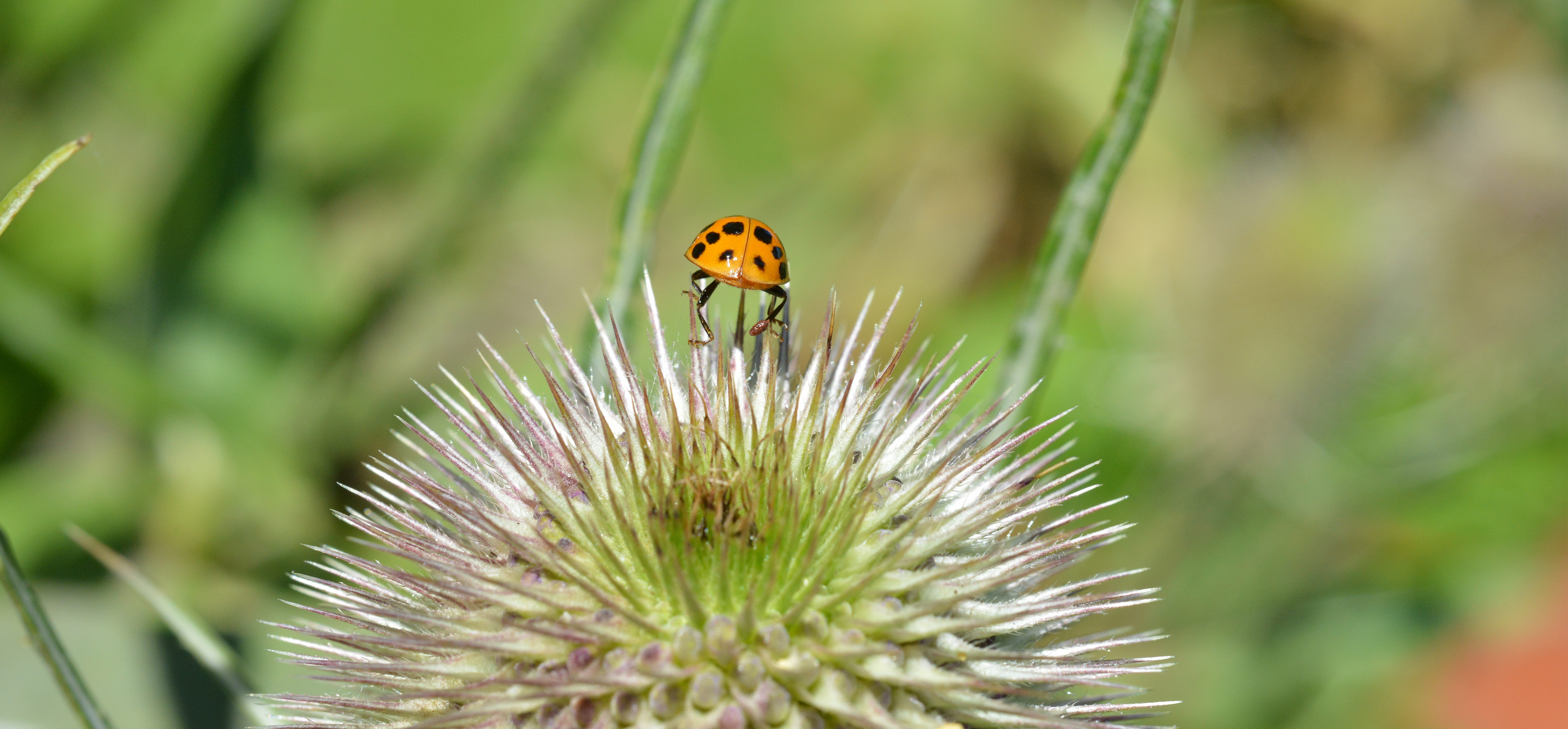 een lieveheersbeestje probeert over een kaardenbol te lopen.