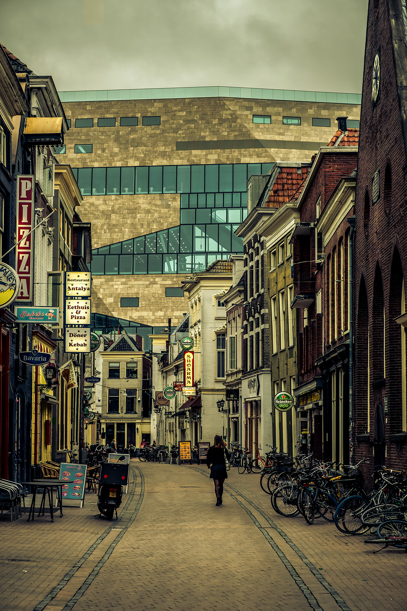 Het grote gebouw achter de straat geeft een surrealistisch effect...