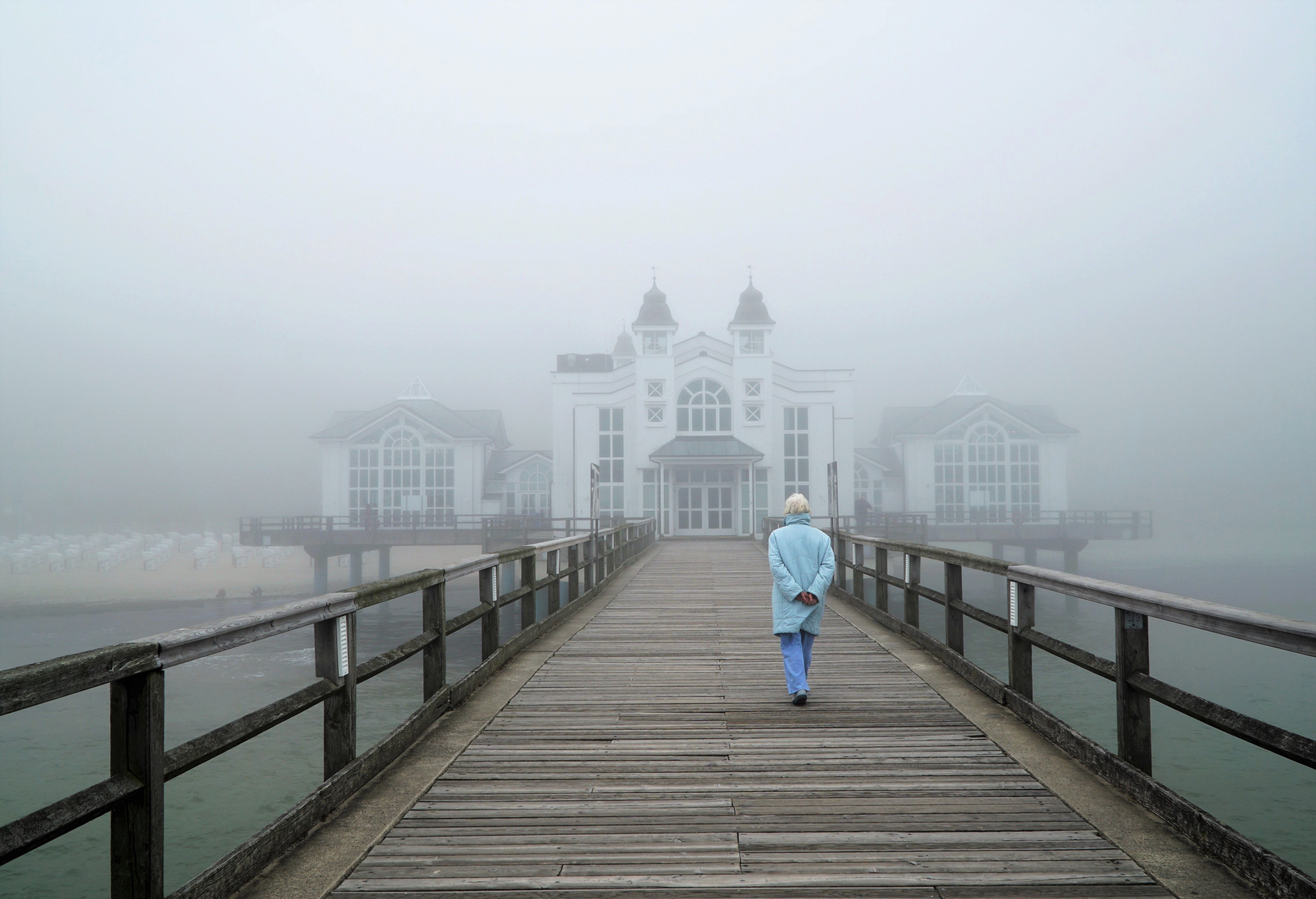 Een mistige dag aan het strand in Sellin, op het eiland Rugen, Duitsland.